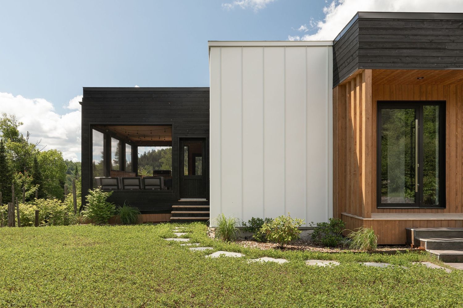 Maison bioclimatique bâtie dans un écodomaine à Val-David. La fenestration abondante qui donne une vue imprenable sur les montagnes efface la barrière entre la maison et la nature pour ne faire qu'un avec elle. Le choix de matériaux durables et innovateurs est parfaitement agencé. La maison est lumineuse et harmonieuse et présente des choix de matériaux à la fois durables, harmonieux et élégants.
