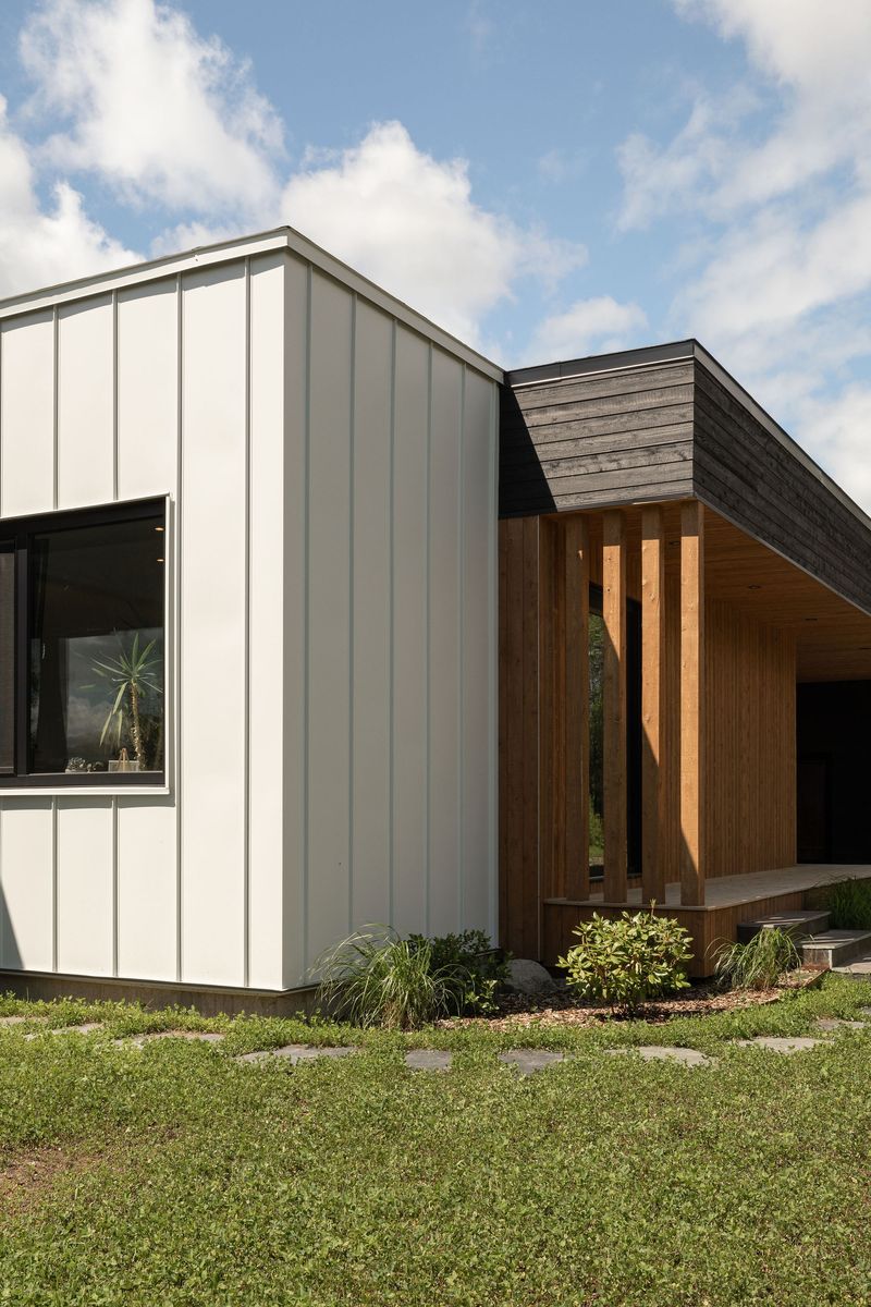 Maison bioclimatique bâtie dans un écodomaine à Val-David. La fenestration abondante qui donne une vue imprenable sur les montagnes efface la barrière entre la maison et la nature pour ne faire qu'un avec elle. Le choix de matériaux durables et innovateurs est parfaitement agencé. La maison est lumineuse et harmonieuse et présente des choix de matériaux à la fois durables, harmonieux et élégants.