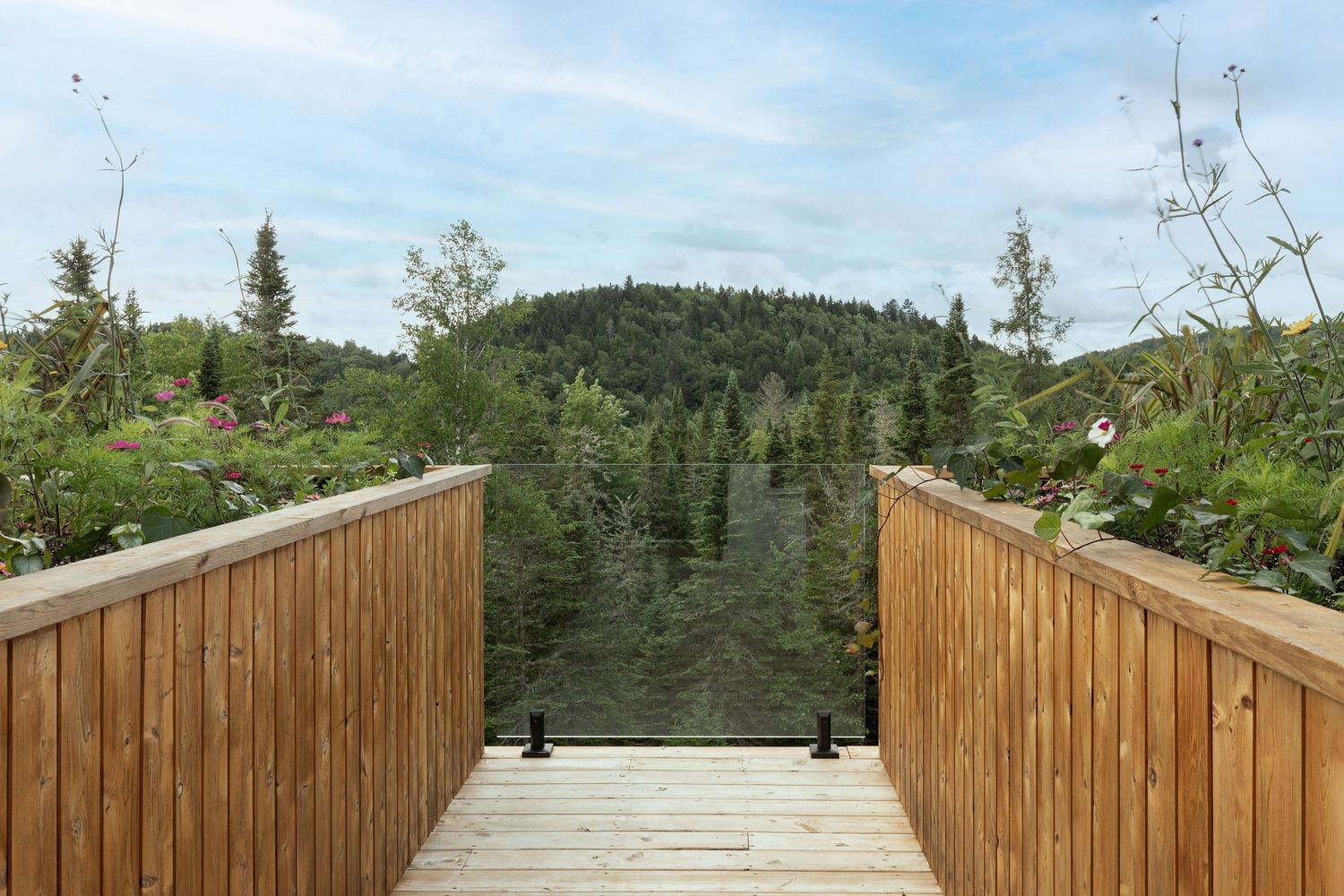 Maison bioclimatique bâtie dans un écodomaine à Val-David. La fenestration abondante qui donne une vue imprenable sur les montagnes efface la barrière entre la maison et la nature pour ne faire qu'un avec elle. Le choix de matériaux durables et innovateurs est parfaitement agencé. La maison est lumineuse et harmonieuse et présente des choix de matériaux à la fois durables, harmonieux et élégants.