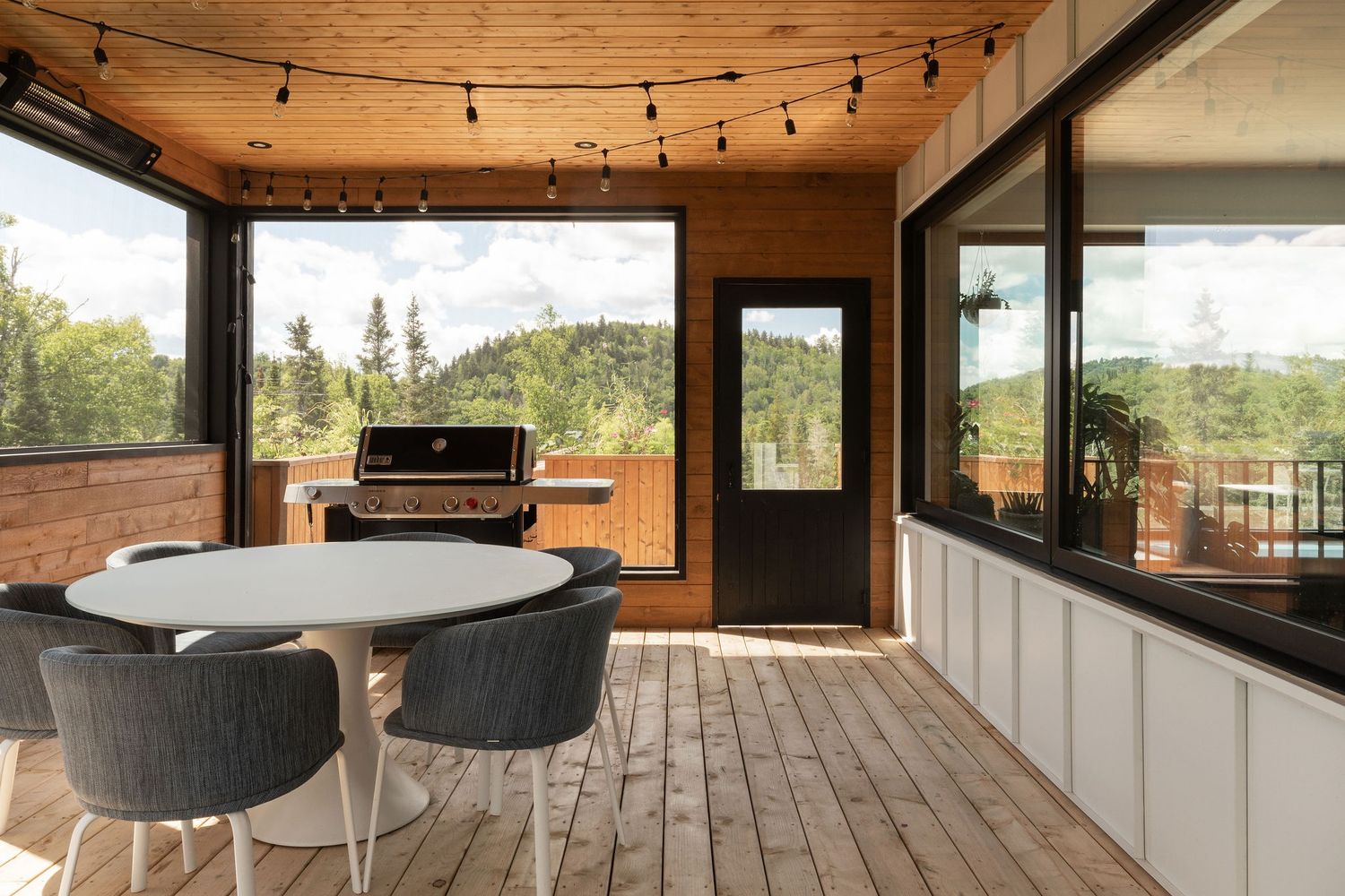 Maison bioclimatique bâtie dans un écodomaine à Val-David. La fenestration abondante qui donne une vue imprenable sur les montagnes efface la barrière entre la maison et la nature pour ne faire qu'un avec elle. Le choix de matériaux durables et innovateurs est parfaitement agencé. La maison est lumineuse et harmonieuse et présente des choix de matériaux à la fois durables, harmonieux et élégants.