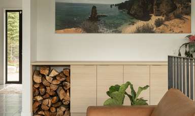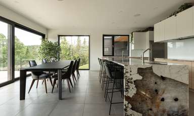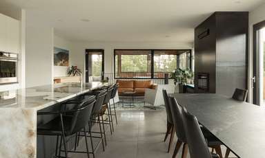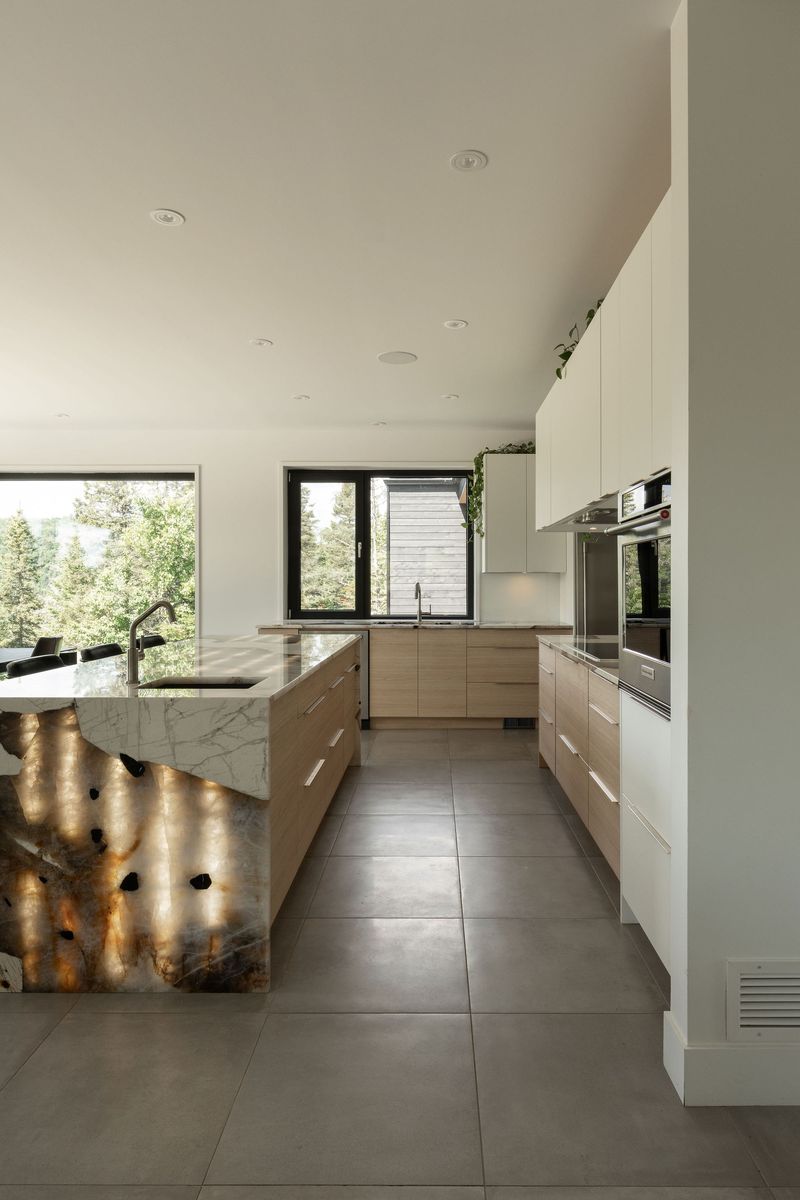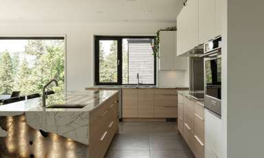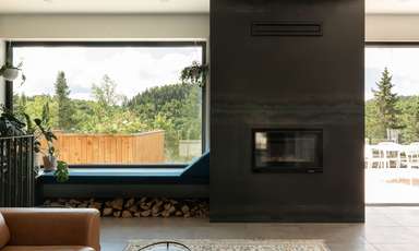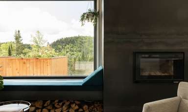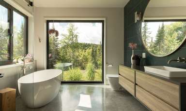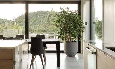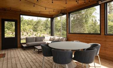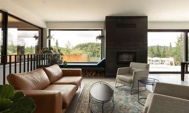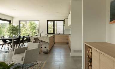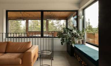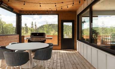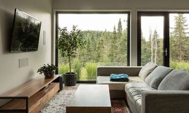 Maison bioclimatique bâtie dans un écodomaine à Val-David. La fenestration abondante qui donne une vue imprenable sur les montagnes efface la barrière entre la maison et la nature pour ne faire qu'un avec elle. Le choix de matériaux durables et innovateurs est parfaitement agencé. La maison est lumineuse et harmonieuse et présente des choix de matériaux à la fois durables, harmonieux et élégants.