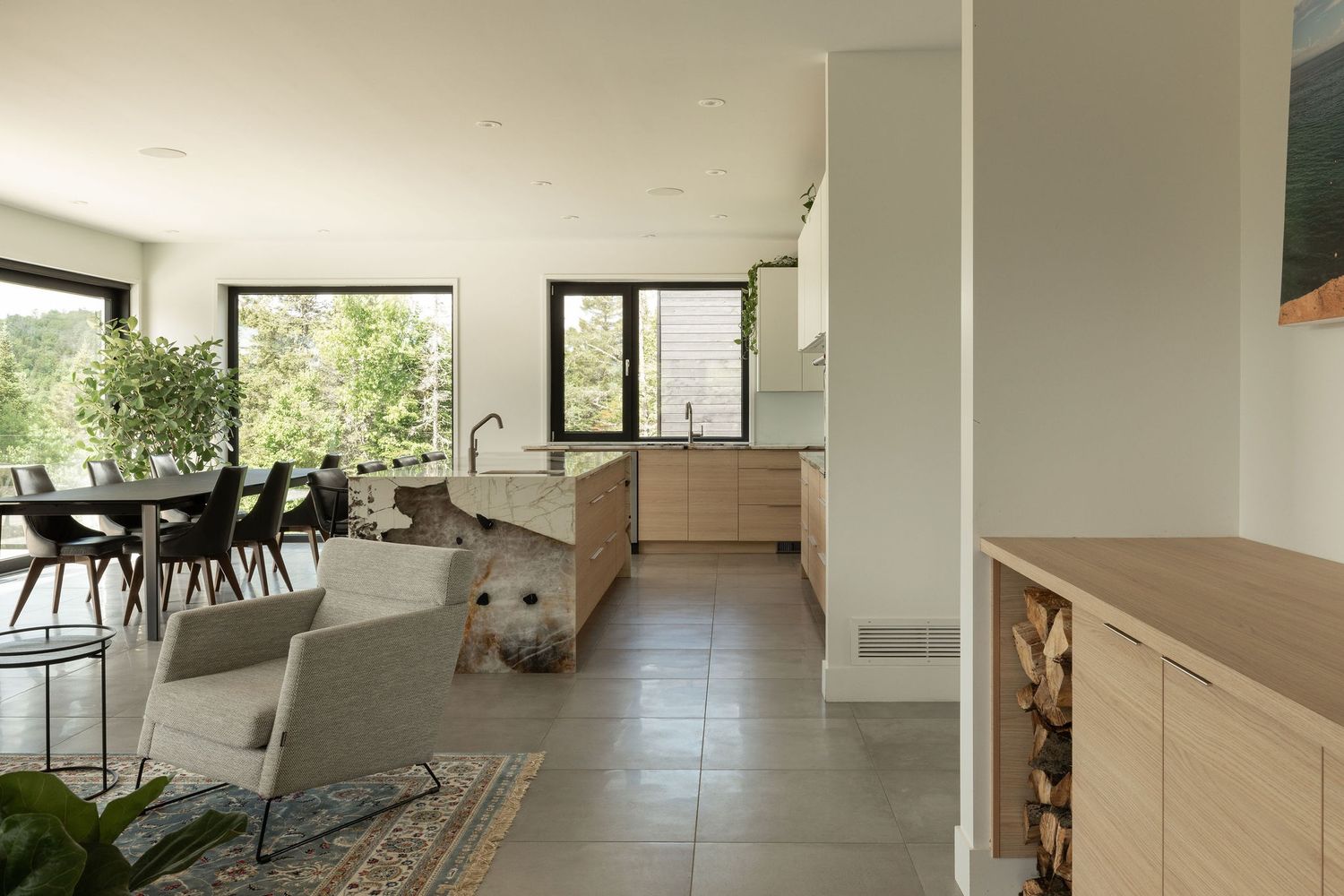 Maison bioclimatique bâtie dans un écodomaine à Val-David. La fenestration abondante qui donne une vue imprenable sur les montagnes efface la barrière entre la maison et la nature pour ne faire qu'un avec elle. Le choix de matériaux durables et innovateurs est parfaitement agencé. La maison est lumineuse et harmonieuse et présente des choix de matériaux à la fois durables, harmonieux et élégants.