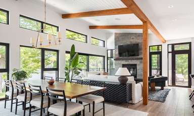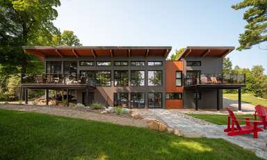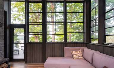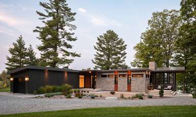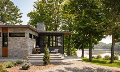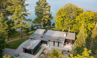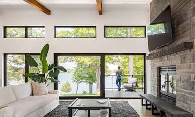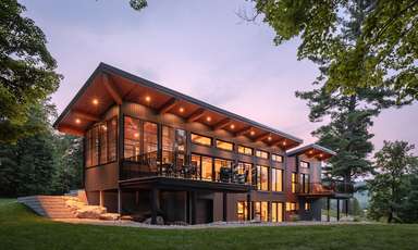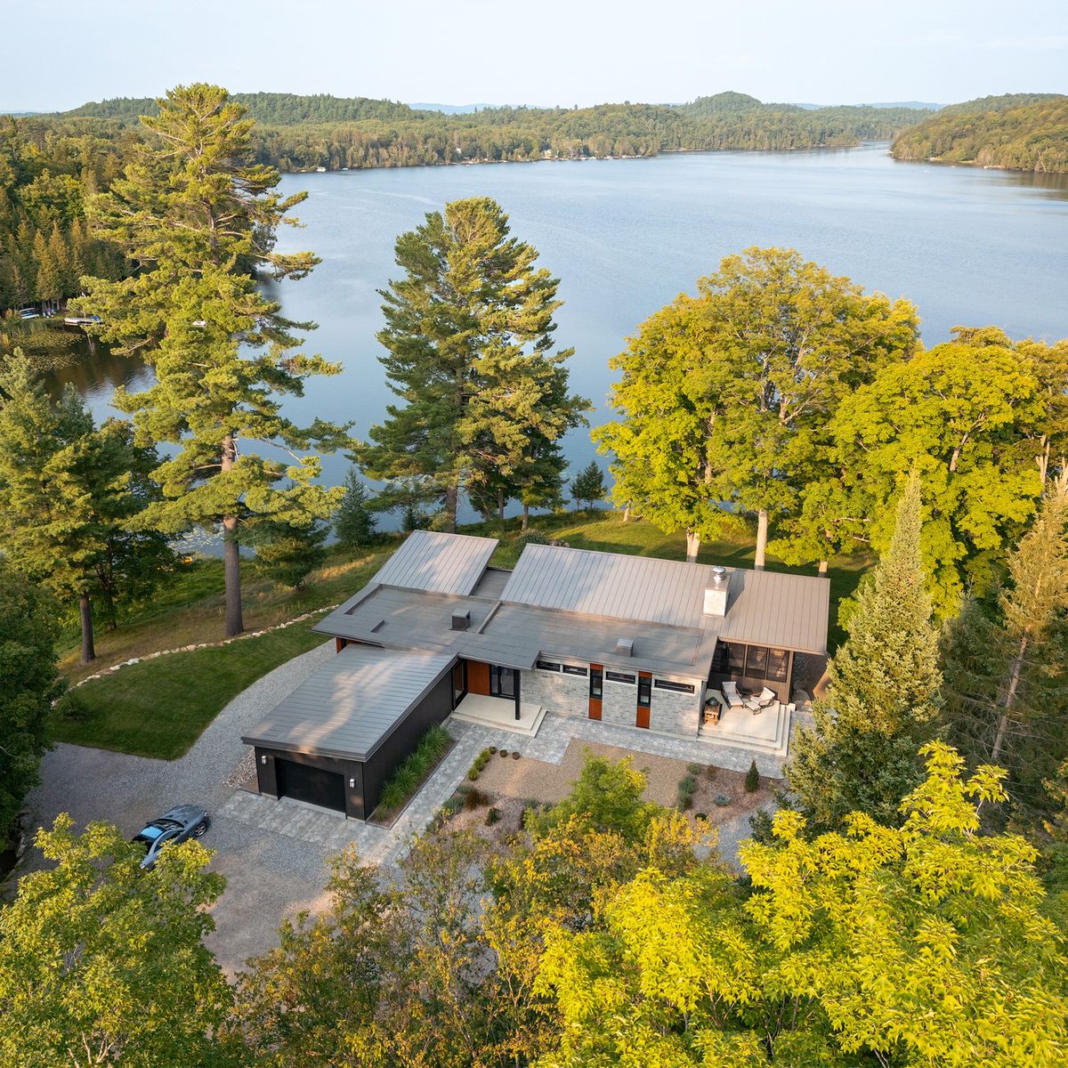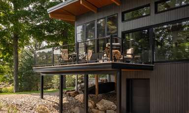 La quantité importante de vitrage intégrée pour les vues et l’éclairage naturel est équilibrée par la façade nord, où se situe l’entrée de la maison d’un étage. Les fenêtres et les surfaces transparentes y sont contrôlées et limitées pour mieux révéler l’espace à double hauteur et les vues sur le lac et le site depuis l’intérieur du chalet.