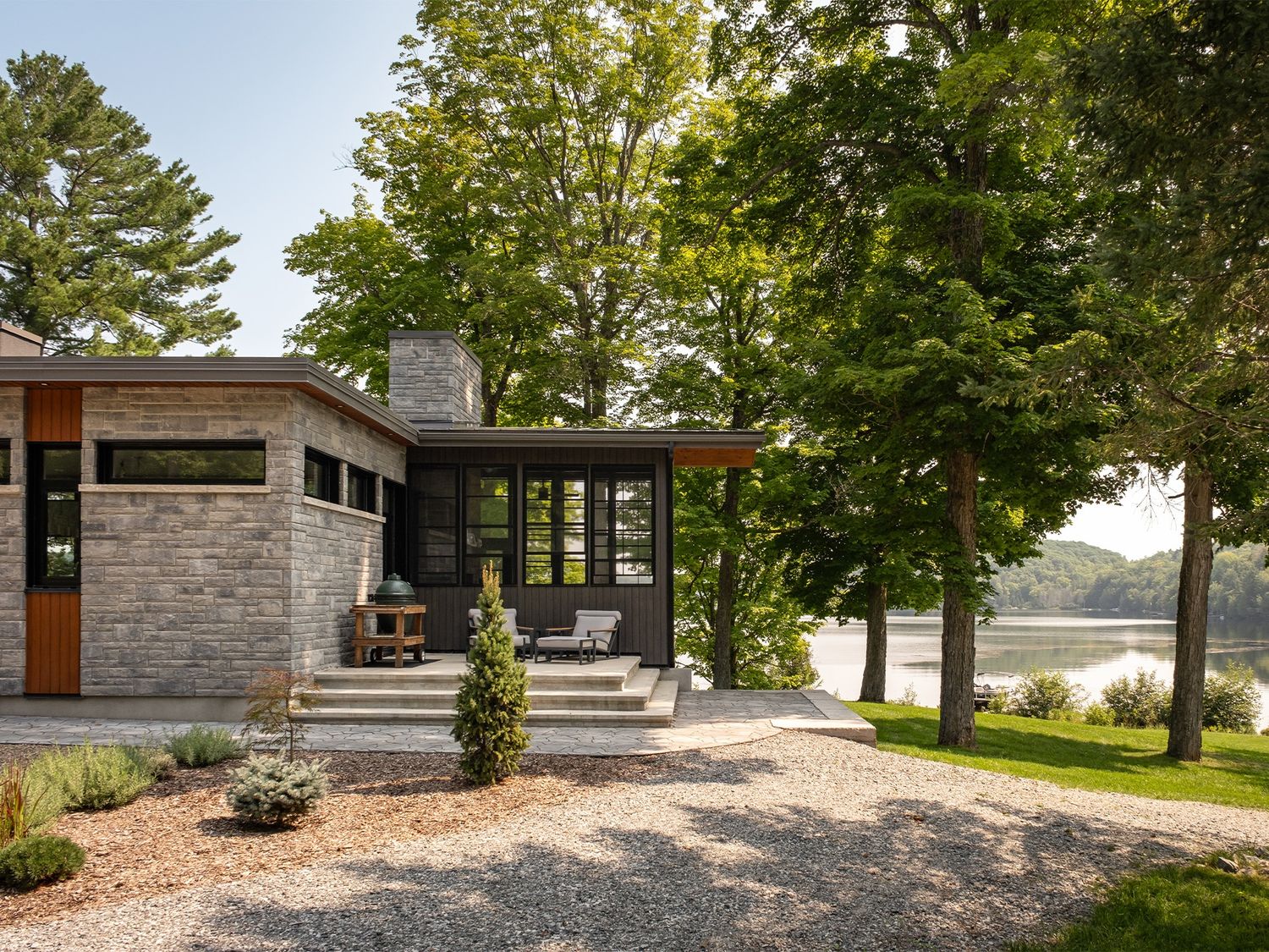 La quantité importante de vitrage intégrée pour les vues et l’éclairage naturel est équilibrée par la façade nord, où se situe l’entrée de la maison d’un étage. Les fenêtres et les surfaces transparentes y sont contrôlées et limitées pour mieux révéler l’espace à double hauteur et les vues sur le lac et le site depuis l’intérieur du chalet.