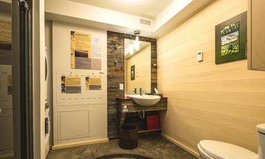 Épargnes substantielles sur la facture d’énergie Indépendance vis-à-vis des énergies fossiles Confort accru et inégalé Températures intérieures équilibrées Pas de surchauffe en été Beaucoup de lumière via de grandes surfaces vitrées au sud Habitat sain et qualité d’air supérieur Régulation du taux d’humidité Très durable Valeur immobilière élevée Certifiée LEED® Platine Érigée principalement avec des matériaux naturels issus de ressources renouvelables exploitées et transformées localement Protégée contre le radon Dotée d’un système de récupération de chaleur des eaux grises Exempte d’urée-formaldéhyde ajouté Pourvue d’appareils Energy Star® très efficaces A détourné des sites d’enfouissement 80% des déchets de construction Munie d’ampoules DEL dans toutes les pièces Isolée avec des isolants naturels (cellulose, fibre de bois et paille) Prête pour le solaire (Solar Ready) Munie de robinets, pommes de douche et toilettes à très faible débit (la toilette, de conception canadienne, utilise 3L par chasse, soit la meilleure performance sur le marché) Possède finalement une cour aussi verte que la maison (sols perméables, récupération d’eau de pluie, couvre-sols nécessitant peu d’entretien, espèces indigènes, potager biologique, toit végétal et gestion écologique du sentier).