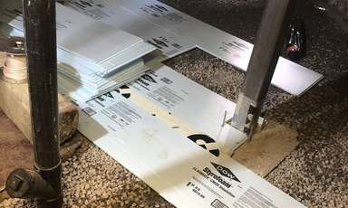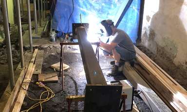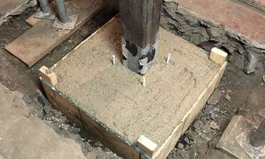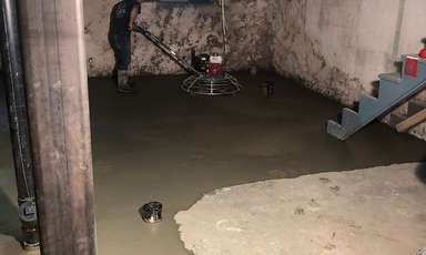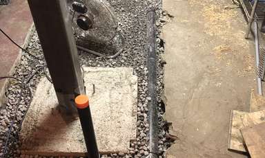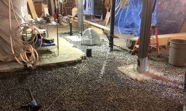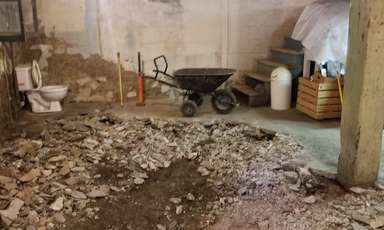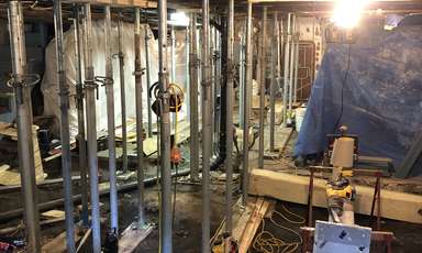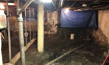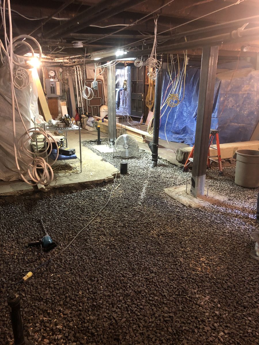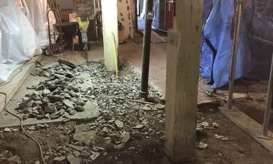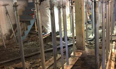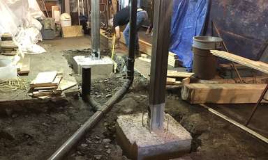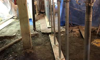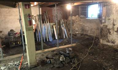 Maison de 1905 avec fondations en moelon. Soutennement de la maison et retrait des poutres et colonnes en bois et remplacement de celles-çi par des LVL et colonnes d'acier soudée. Retrait de la dalle de sol afin de remplacer la plomberie sous terrain, d'isoler et d'installer un pare vapeur afin de rendre la pièce plus agréable et moins humide.