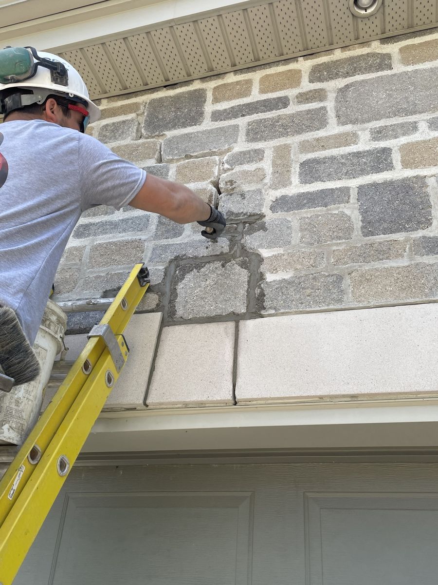 Réfection complète des marches d'entrée en béton, des murets en pierre permacon, réparation aléatoire de la maçonnerie, installation de scellant flexible au endroits propices à la fissuration, installation de grille anti vermine dans les chantepleures, et finition de l'entrée et des escaliers en crépi acrylique renforcé par un treilli de fibre de verre.