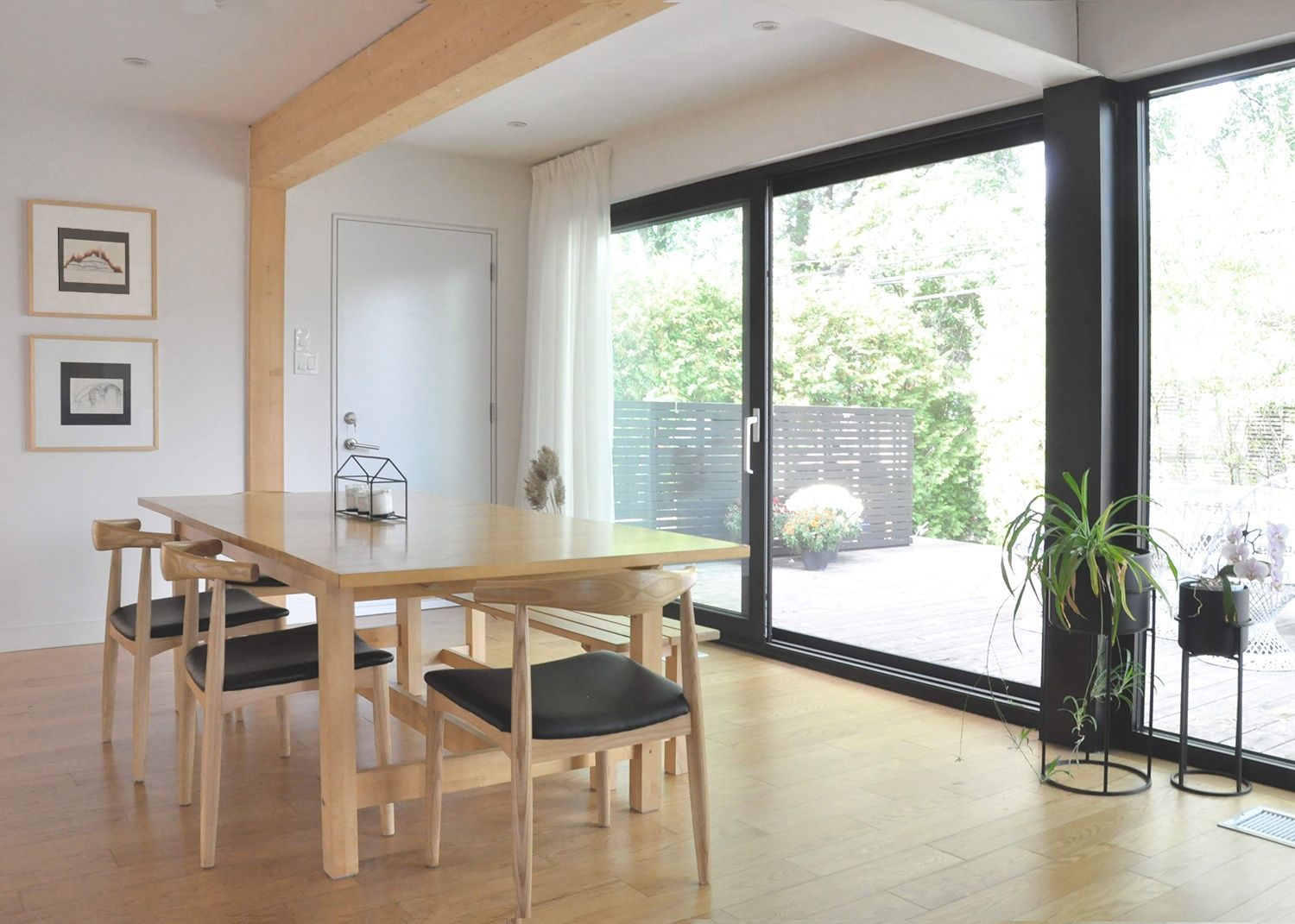 Le projet a consisté en une reconfiguration totale du rez-de-chaussée, transformant l’espace en un séjour à aire ouverte, propice à la vie moderne et conviviale. L’un des deux murs porteurs a été remplacé par une grande poutre structurelle qui traverse désormais la maison. La façade avant, en brique rouge, a été conservée pour préserver le charme et l’authenticité du bâtiment, tandis que la façade arrière a été réaménagée pour s’ouvrir complètement sur le jardin, grâce à l’installation de portes-fenêtres généreuses, offrant ainsi une connexion directe avec l’extérieur et maximisant la luminosité intérieure.