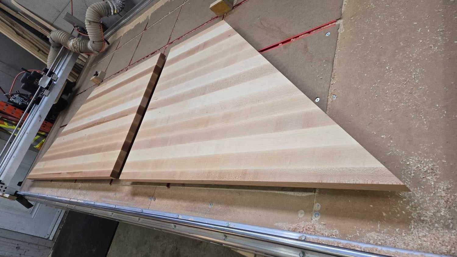 Réalisation de comptoirs de cuisine en érable. 4 comptoirs à grain horizontal et un comptoir à grain debout. Bandeau de hotte et tablettes en chêne rouge.