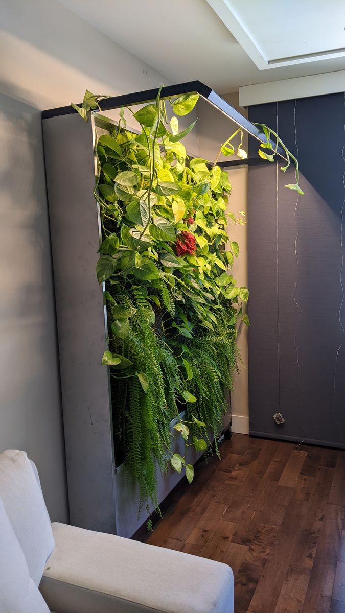 En collaboration avec un client résidentiel, La Ligne Verte a conçu un mur végétal hydroponique autoportant, parfaitement intégré dans une pièce existante.