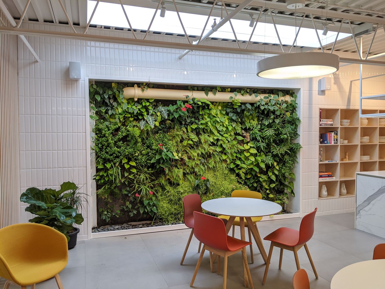 Le mur végétal, situé dans une aire ouverte combinant salle à manger, coin lecture, et machine à espresso, ajoute une touche de verdure tout en améliorant la qualité de l’air et l’acoustique des lieux. Adjacent à la salle de réunion, cet espace devient un véritable point de convergence pour les employés, favorisant la synergie et le bien-être dans le cadre de travail.