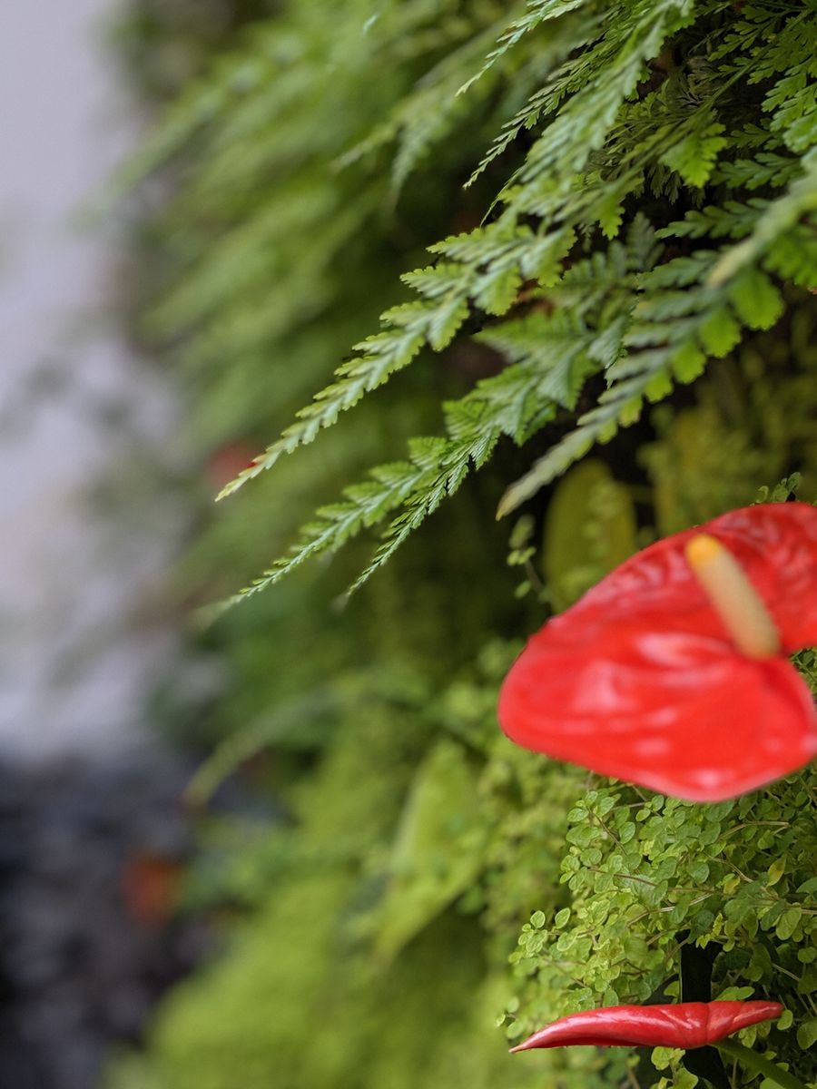 Le projet a inclus un mandat complet de conception et d’installation. Un réservoir avec un système d’irrigation automatisé, installé dans une salle sous-jacente, assure l’entretien minimal requis pour ce mur vert hydroponique.