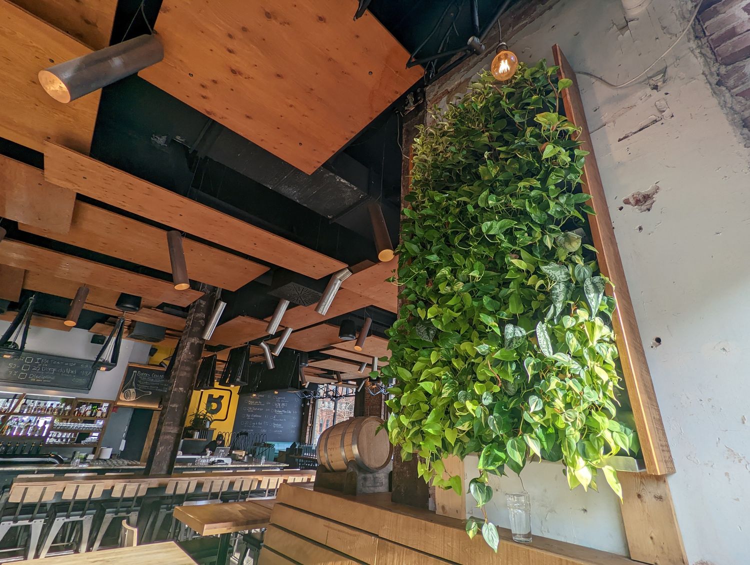 Le mur végétal a été conçu pour s’harmoniser parfaitement avec l’esthétique brute et chaleureuse du bistro. Avec une finition latérale en bois, il s'intègre au décor tout en mettant en valeur la brique d’origine. La structure, composée de matériaux robustes tels que le contreplaqué et l’acier inoxydable, offre une durabilité optimale dans un espace fréquenté quotidiennement.