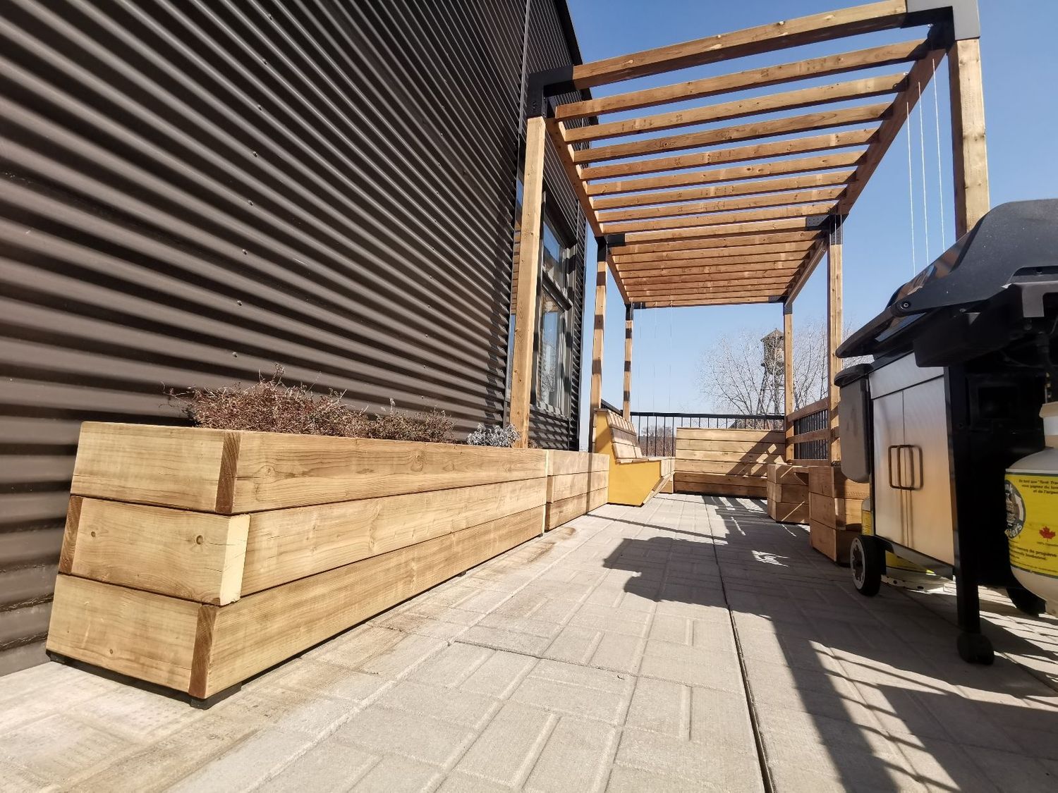 Le concept de cet aménagement était d’améliorer le confort des résidents pendant les chaudes journées ensoleillées. Nous avons donc dessiné et installé une pergola autoportante accompagnée d’une assise. En quelques saisons, les grimpantes vont coloniser la structure et contribuer naturellement à ombrager et rafraîchir cet espace de vie.