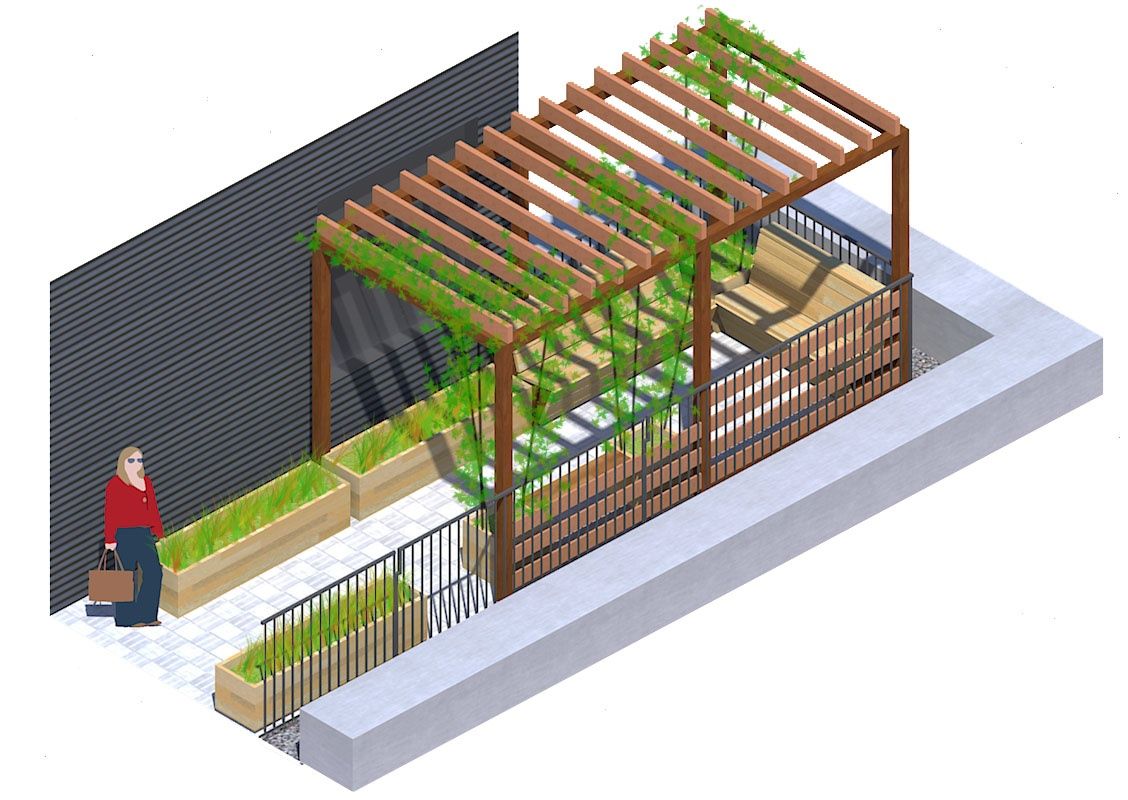 Le concept de cet aménagement était d’améliorer le confort des résidents pendant les chaudes journées ensoleillées. Nous avons donc dessiné et installé une pergola autoportante accompagnée d’une assise. En quelques saisons, les grimpantes vont coloniser la structure et contribuer naturellement à ombrager et rafraîchir cet espace de vie.