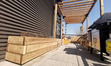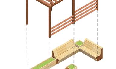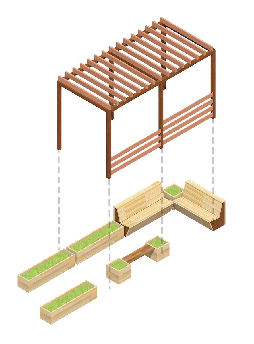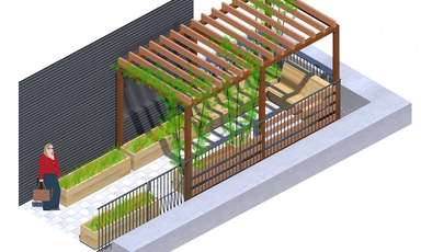Le concept de cet aménagement était d’améliorer le confort des résidents pendant les chaudes journées ensoleillées. Nous avons donc dessiné et installé une pergola autoportante accompagnée d’une assise. En quelques saisons, les grimpantes vont coloniser la structure et contribuer naturellement à ombrager et rafraîchir cet espace de vie.