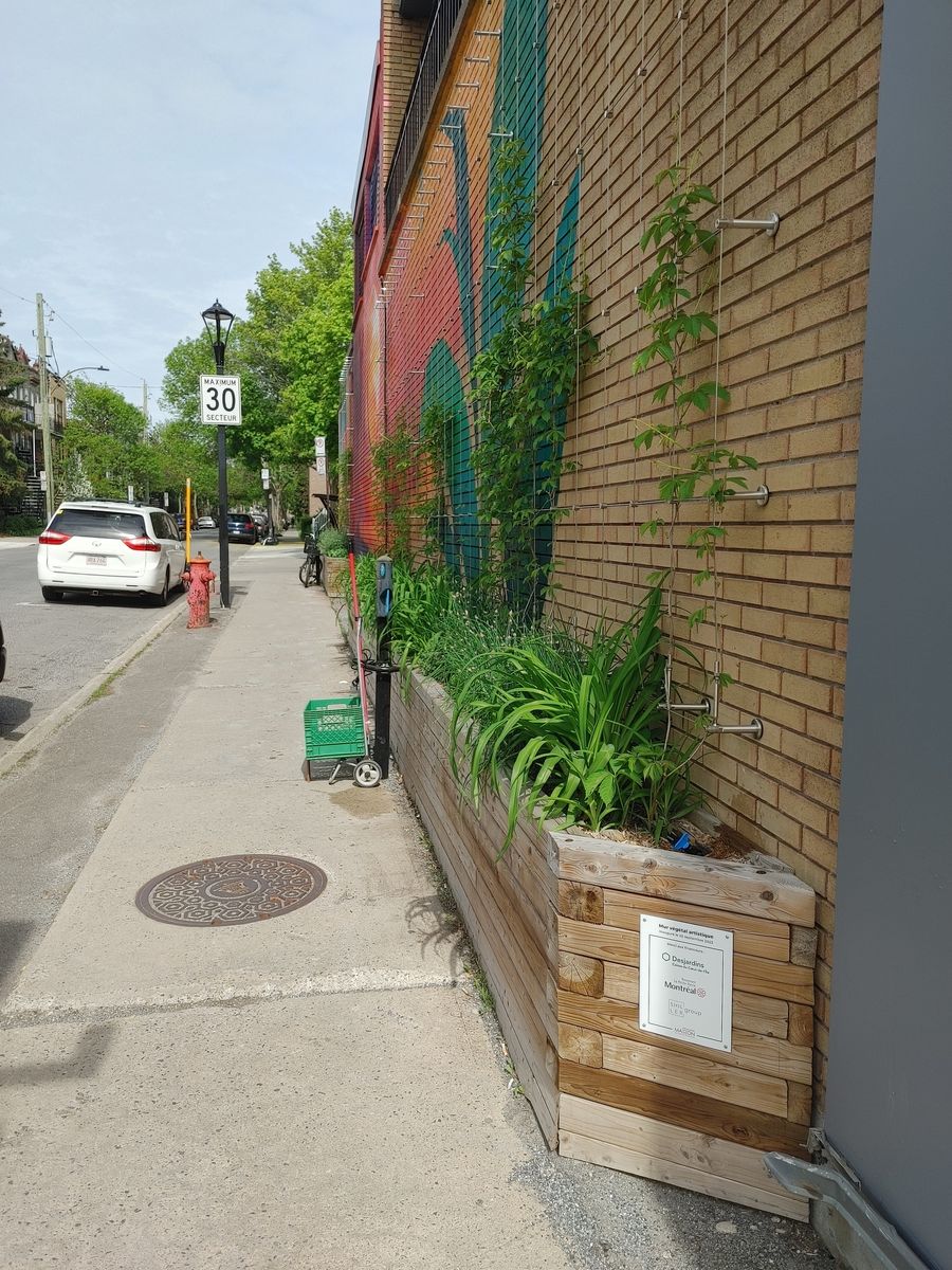 En exploitant l’espace interstitiel en façade du bâtiment, nous avons installé un long bac agrémenté d’un treillis architectural qui favorise la croissance de plantes grimpantes à travers une fresque murale réalisée.