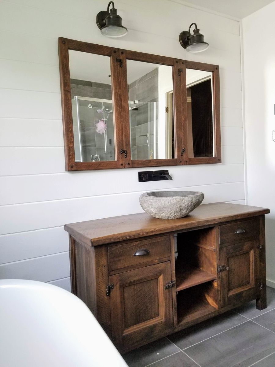 Un mariage réussi entre l'authenticité du bois rustique et la modernité du béton. Notre projet met en scène un pin massif aux veinages prononcés pour les meubles et les miroirs, contrastant avec la vasque de pierre et le mur d'enduit .