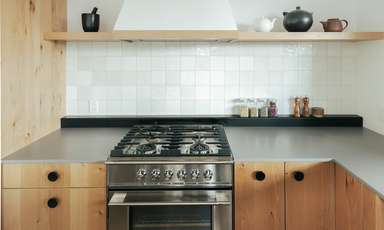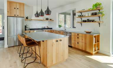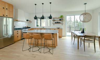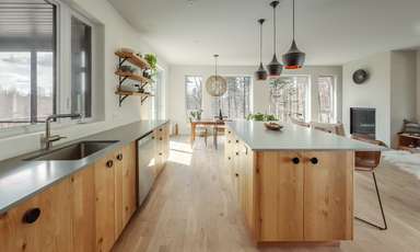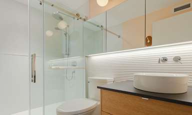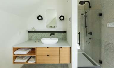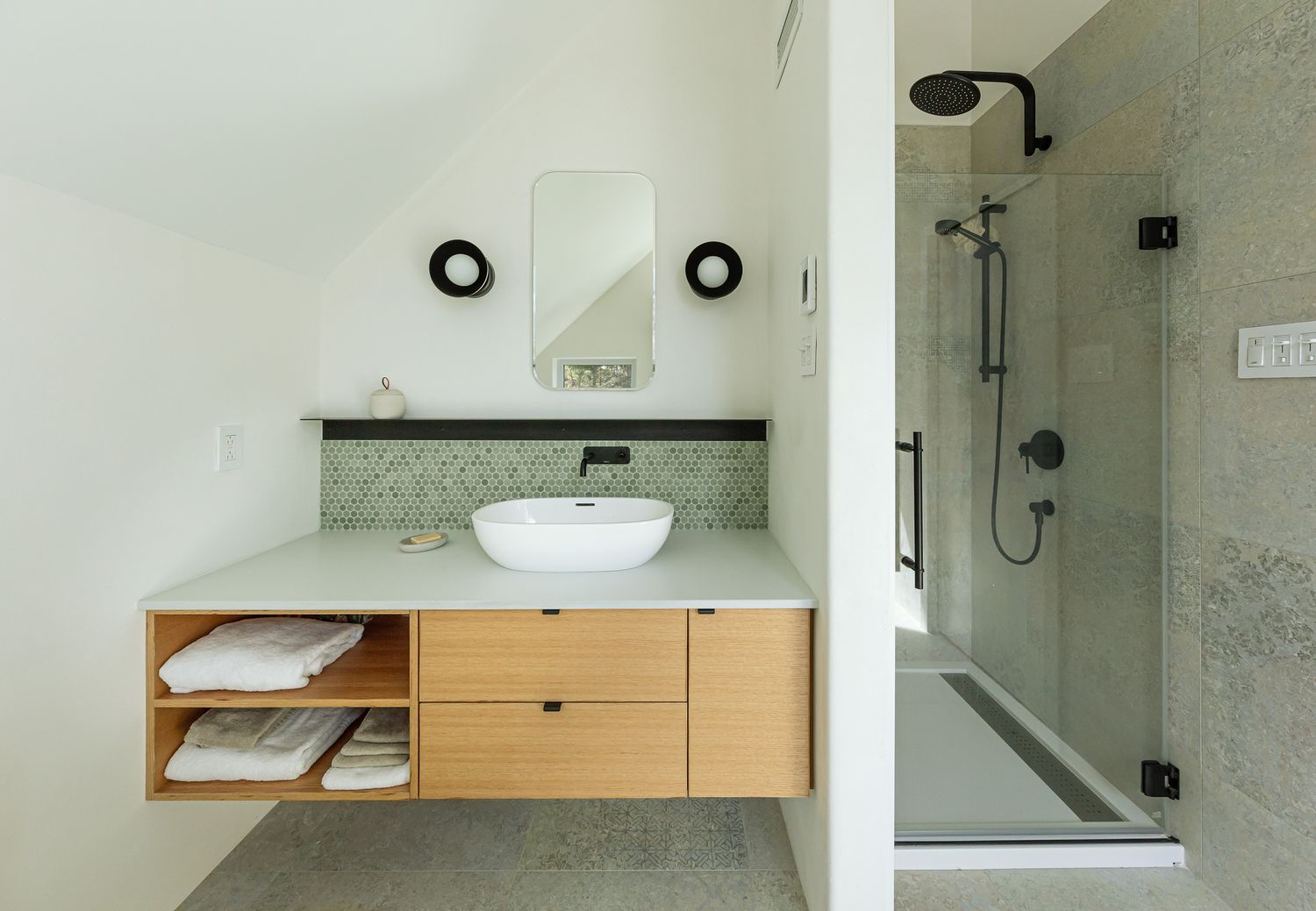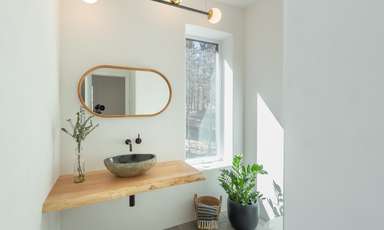 Composition de matières riches et de volumes épurés. luminaires sculpturaux céramique "penny round" en verre recyclé comptoirs de porcelaine Lapitec vanité suspendue au fini chêne blanc Recherches associées Salle de bain Saint-Jérôme/Blainville (Laurentides) Dépense Luminaires Îlot Banquette Design
