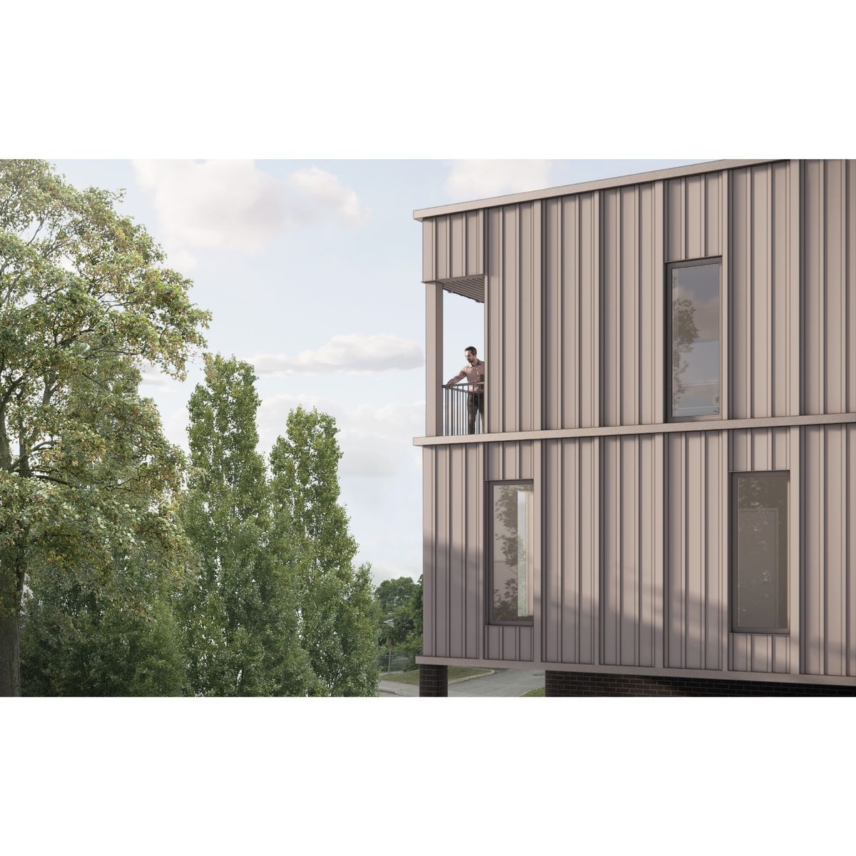 La structure de 3 étages sera entièrement faite en bois (ossature légère) avec les pièces d'acier requises afin d'optimiser la charpente. La proximité des limites de propriétés nous a amenés à choisir des revêtements incombustibles pour les façades. Nous en avons profité pour diviser et rythmer le parement avec des pliages et des panneaux modulaires qui ont nécessité une bonne réflexion avec l'entrepreneur afin d'en assurer la qualité.