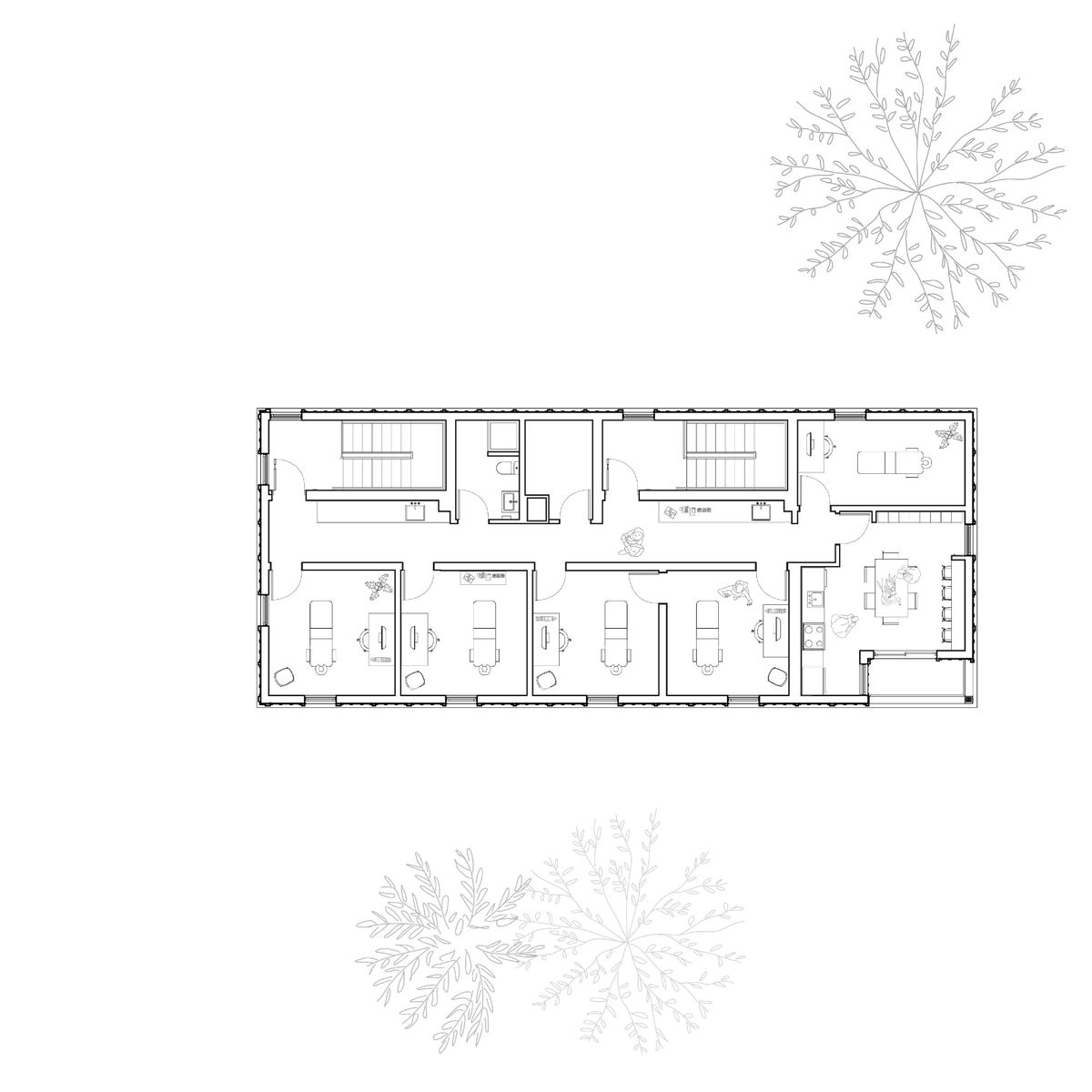 Les plans résultent d'une analyse détaillée de l'ensoleillement ainsi que des diverses contraintes du site et du programme architectural. Le rez-de-chaussée, plus compact, permet aux étages de s'étendre au-dessus de l'allée de circulation principale, optimisant ainsi les aménagements extérieurs, y compris le stationnement. Les nouveaux espaces proposent 14 salles de traitement, dont une spécifiquement dédiée à la décompression discale.