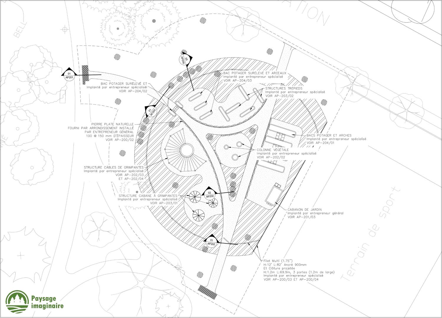 Au cœur du jardin, du printemps à l'automne, des centaines de plants annuels d'une cinquantaine de variétés différentes voleront la vedette. Elles seront réparties au travers 19 structures d'agriculture verticale incluant des arches, des cabanes à grimpantes, des murs-trépieds, des bacs potagers avec arceaux ou encore des colonnes végétales. Ceinturant ces salles d'expositions à aire ouverte, de large plates-bandes d'arbres, d'arbustes et de vivaces comestibles ornent le jardin. La vaste majorité des espèces sélectionnées sont indigènes et amies des pollinisateurs. Le tout selon une soixantaine de variétés différentes.