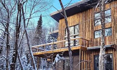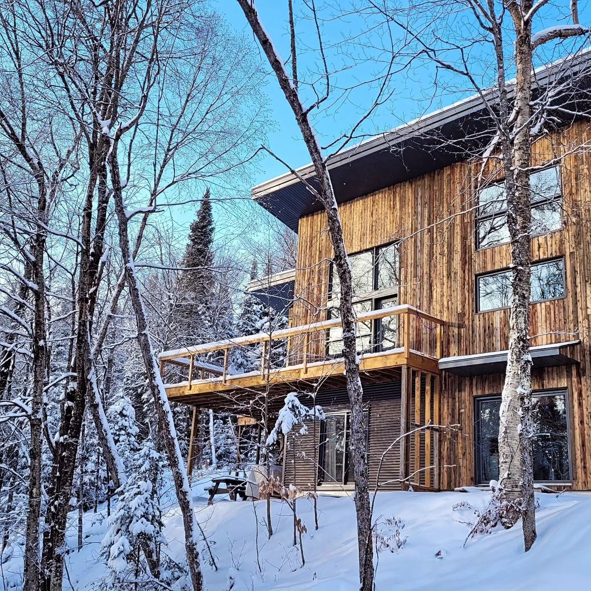 Cèdre brute lifetime, tôle corrugé charbon, toit monopente, laurentides
