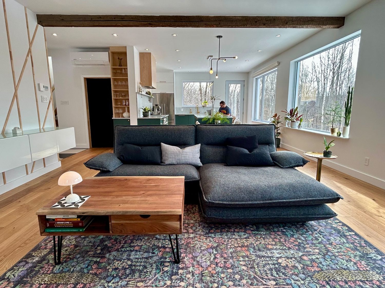 Finalement, nous sommes fiers d’avoir mis en œuvre ce projet qui se démarque par la qualité des matériaux choisis autant en ce qui concerne la finition intérieure que l’enveloppe du bâtiment ( qui a obtenu 0,36 CHA lors de son test d’infiltrométrie).