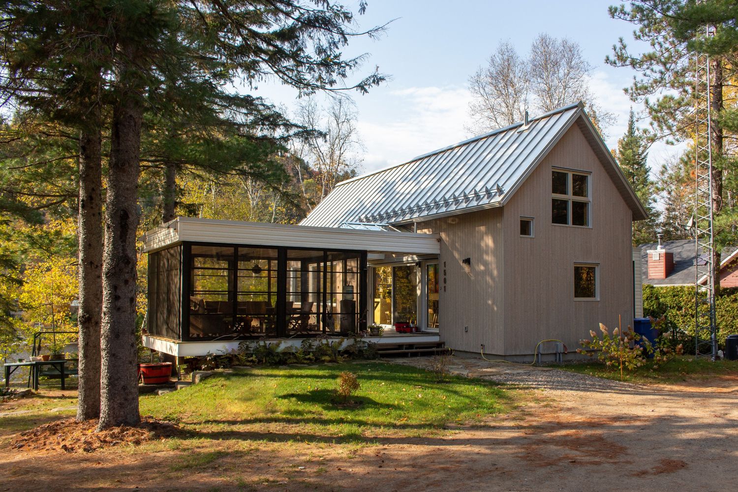 Le concept est simple, soit l’imbrication de deux volumes. Le corps de bâtiment principal emprunte le langage formel et primitif de la maison traditionnelle. Il est donc constitué d’une toiture métallique à deux versants et un revêtement mural en cèdre de l’est. On y retrouve des chambres et des espaces techniques au rez-de-jardin, les espaces de séjour au rez-de-chaussée et un bureau en mezzanine. Un second volume aux formes plus contemporaines cette fois s’insère dans le précédent et héberge quant à lui une chambre au nord et une terrasse extérieure couverte au sud.