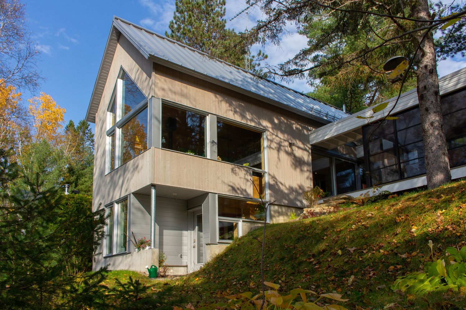 Le concept est simple, soit l’imbrication de deux volumes. Le corps de bâtiment principal emprunte le langage formel et primitif de la maison traditionnelle. Il est donc constitué d’une toiture métallique à deux versants et un revêtement mural en cèdre de l’est. On y retrouve des chambres et des espaces techniques au rez-de-jardin, les espaces de séjour au rez-de-chaussée et un bureau en mezzanine. Un second volume aux formes plus contemporaines cette fois s’insère dans le précédent et héberge quant à lui une chambre au nord et une terrasse extérieure couverte au sud.