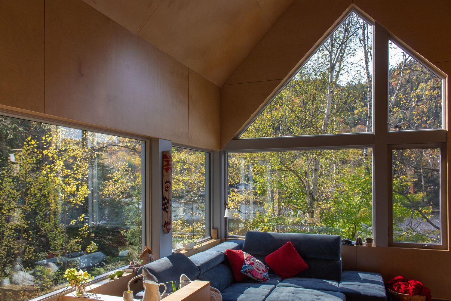 Le concept est simple, soit l’imbrication de deux volumes. Le corps de bâtiment principal emprunte le langage formel et primitif de la maison traditionnelle. Il est donc constitué d’une toiture métallique à deux versants et un revêtement mural en cèdre de l’est. On y retrouve des chambres et des espaces techniques au rez-de-jardin, les espaces de séjour au rez-de-chaussée et un bureau en mezzanine. Un second volume aux formes plus contemporaines cette fois s’insère dans le précédent et héberge quant à lui une chambre au nord et une terrasse extérieure couverte au sud.