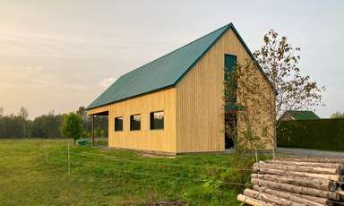 Après le triste incendie de l’ancienne grange plus que centenaire, le propriétaire désirait en rebâtir une nouvelle, mais aux dimensions plus modestes cette fois. Le nouveau projet devait être polyvalent autant au niveau de la programmation que sur la durée dans le temps. Au rez-de-chaussée, il est donc possible d’y héberger un petit troupeau de moutons ou encore d’y intégrer des boxs de chevaux. Les grandes portes coulissantes permettent également d’y stationner deux véhicules au besoin. Puis, on retrouve un espace atelier isolé. Au niveau supérieur, on peut y stocker le foin et profiter d’une vue spectaculaire sur les champs et la forêt. Ce deuxième étage se prolonge au-delà du rez-de-chaussée pour offrir un espace extérieur, mais couvert pour abriter les animaux lors de temps pluvieux. Cet espace pourra aisément être fermé par le propriétaire dans le futur selon les besoins. Doté d’un budget restreint et d’un désir de simplicité formelle en harmonie avec le patrimoine agricole régional, le bâtiment est réduit à sa plus grande simplicité. Le bâtiment est constitué d’un plan rectangulaire et d’une toiture à deux versants recouverte d’une tôle verte pour s’agencer avec les autres bâtiments de la propriété. Dans un souci de réduire l’empreinte environnementale de cette construction, l’emploi de matériaux provenant de la région a été préconisé. Une majorité de la charpente provient par ailleurs d’arbres abattus dans la forêt immédiate.
