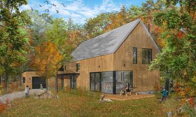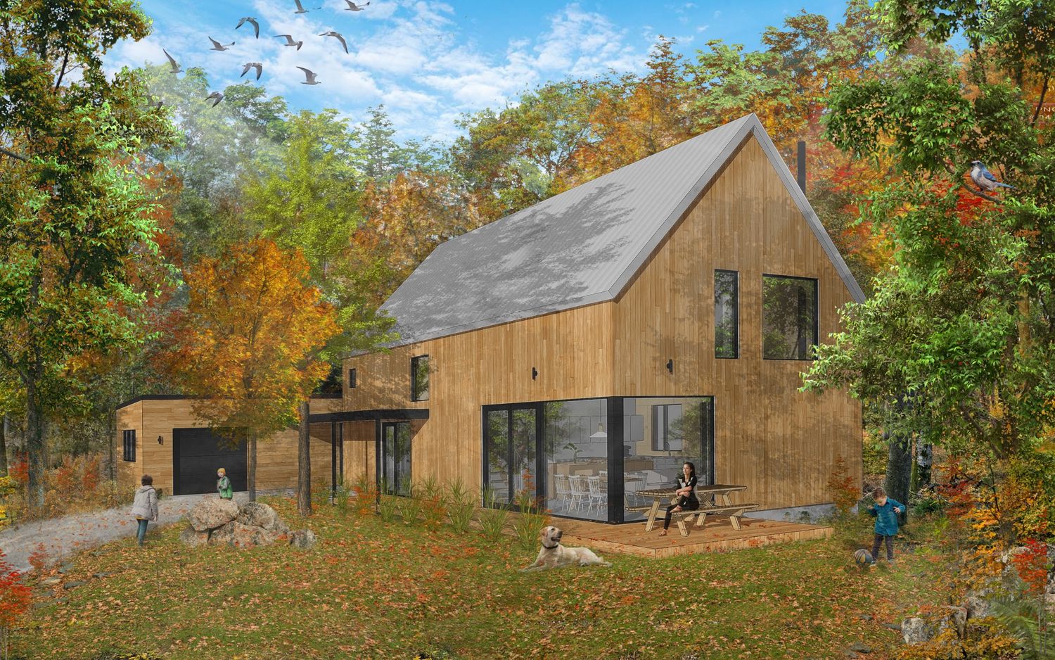 Située dans les Laurentides, cette résidence a été conçue dans une optique de simplicité, puisque les propriétaires désiraient se lancer dans une auto-construction. Au fil des nombreuses idéations, l’implantation du bâtiment s’est finalement arrêtée sur une portion du terrain sans dénivelé et dépourvue d’arbre. Cela a permis de limiter le déboisement tout en profitant d’une lumière naturelle abondante. Le volume de la maison se veut simple avec un plan rectangulaire et une toiture à deux versants. À l’intérieur, les espaces de vie occupent une grande partie du rez-de-chaussée. Les baies vitrées sont généreuses et en communion évidente avec le paysage immédiat. À l’étage, on retrouve les chambres et les espaces de jeux pour les enfants. Les deux étages communiquent physiquement et visuellement grâce à de généreuses ouvertures de plancher. Cela met en valeur la volumétrie architecturale tout en favorisant les interactions entre les membres de la famille. Les propriétaires désiraient intégrer un atelier au projet. C’est donc un second volume au toit plat qui l’abrite. Situé au nord, l’atelier est relié à la maison avec un passage vitré qui sert également d’entrée. Le toit pourra laisser place à une future terrasse ou à un potager.