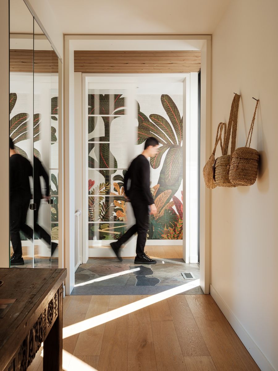 Plancher d'ardoise de la Nouvelle-Écosse. Recherches associées Chambre Montréal/Laval/Longueuil (Grand Montréal) Architecture durable Bois de grange récupéré Maison de ferme contemporaine Construction écoresponsable Domaine agricole Laurentides