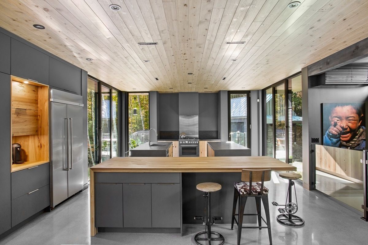 L’espace de vie principal, situé en hauteur, s’ouvre sur une vue majestueuse du Mont-Tremblant. Grâce à une fenestration abondante et à un plafond de bois qui se prolonge vers l’extérieur, la maison semble flotter à la cime des arbres.