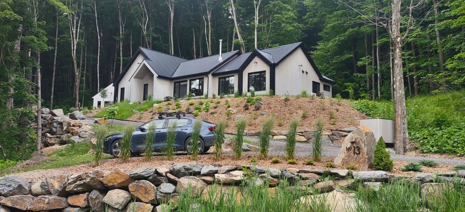 L’un des défis majeurs de ce projet était la gestion d’un talus important à l’avant de la résidence. En collaboration étroite avec les clients, nous avons développé des solutions innovantes pour convertir cette contrainte en un atout visuel. La planification des massifs de végétaux dans cette zone a été pensée pour stabiliser le sol tout en embellissant la pente. Nous avons également conçu un système de drainage pour gérer les eaux de pluie, redirigeant les sorties de gouttières vers une tranchée afin d’assurer un écoulement optimal et éviter l’érosion.