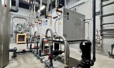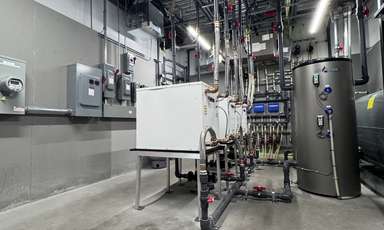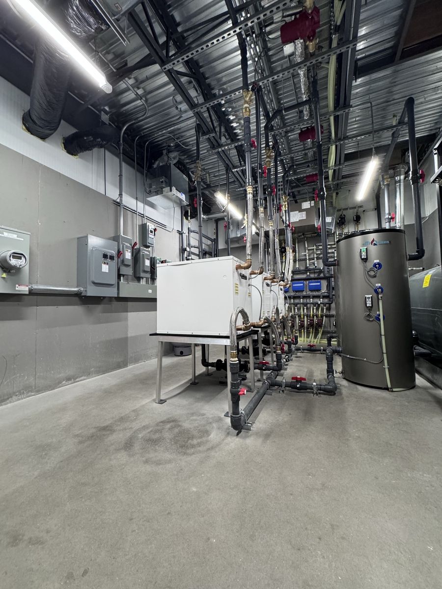 Conception et installation d'un système de chauffage et climatisation par géothermie, comprenant trois thermopompes, un plancher chauffant, ventlation et climatisation zonées par bureau, à l'aide de plusieurs ventiloconvecteurs. Le confort parfait, adjoint d'un système d'humidification et de purification de l'air!