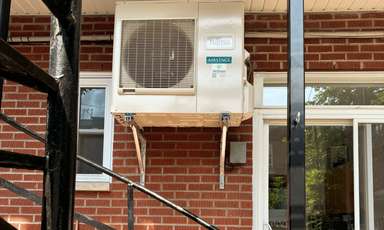 Le balcon arrière, typique des immeubles en brique du Plateau, présentait un espace restreint. Nous avons optimisé l’installation pour préserver l’accès à la porte-patio et respecter les distances minimales de dégagement pour une bonne ventilation du condenseur.