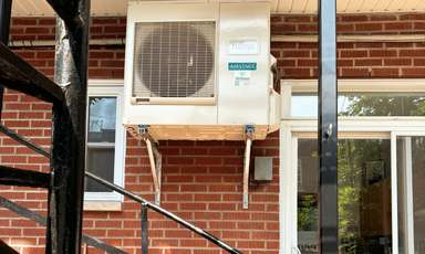 L’unité extérieure a été fixée sur équerres murales renforcées, permettant de libérer l’espace au sol et d’éviter l’accumulation de neige en hiver. Une plateforme de soutien en bois traité a été ajoutée pour réduire les vibrations et améliorer la durabilité.