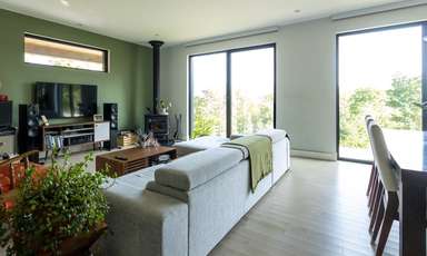 Nos clients avaient également des préoccupations concernant le volet écologique de la construction. Il a donc été question de positionner la maison selon les principes du solaire passif. La façade principale est donc orientée vers le sud pour bénéficier de la chaleur du soleil et ainsi réduire leur consommation d'énergie.