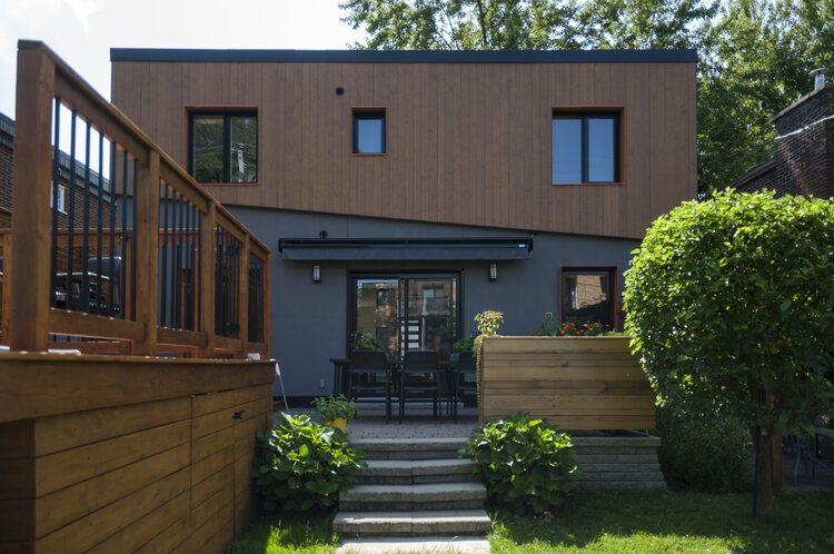 Le projet est né du besoin premier de corriger des problèmes d’infiltrations de l’enveloppe d’une maison unifamiliale existante. Notre proposition revisite le caractère des façades existantes grâce à l’utilisation d’un revêtement de crépis et d’un revêtement de bois en angle, ainsi que par l’ajout de cadres colorés au pourtour des nouvelles fenêtres. Ces modifications confèrent un aspect plus dynamique et contemporain à l’ensemble.