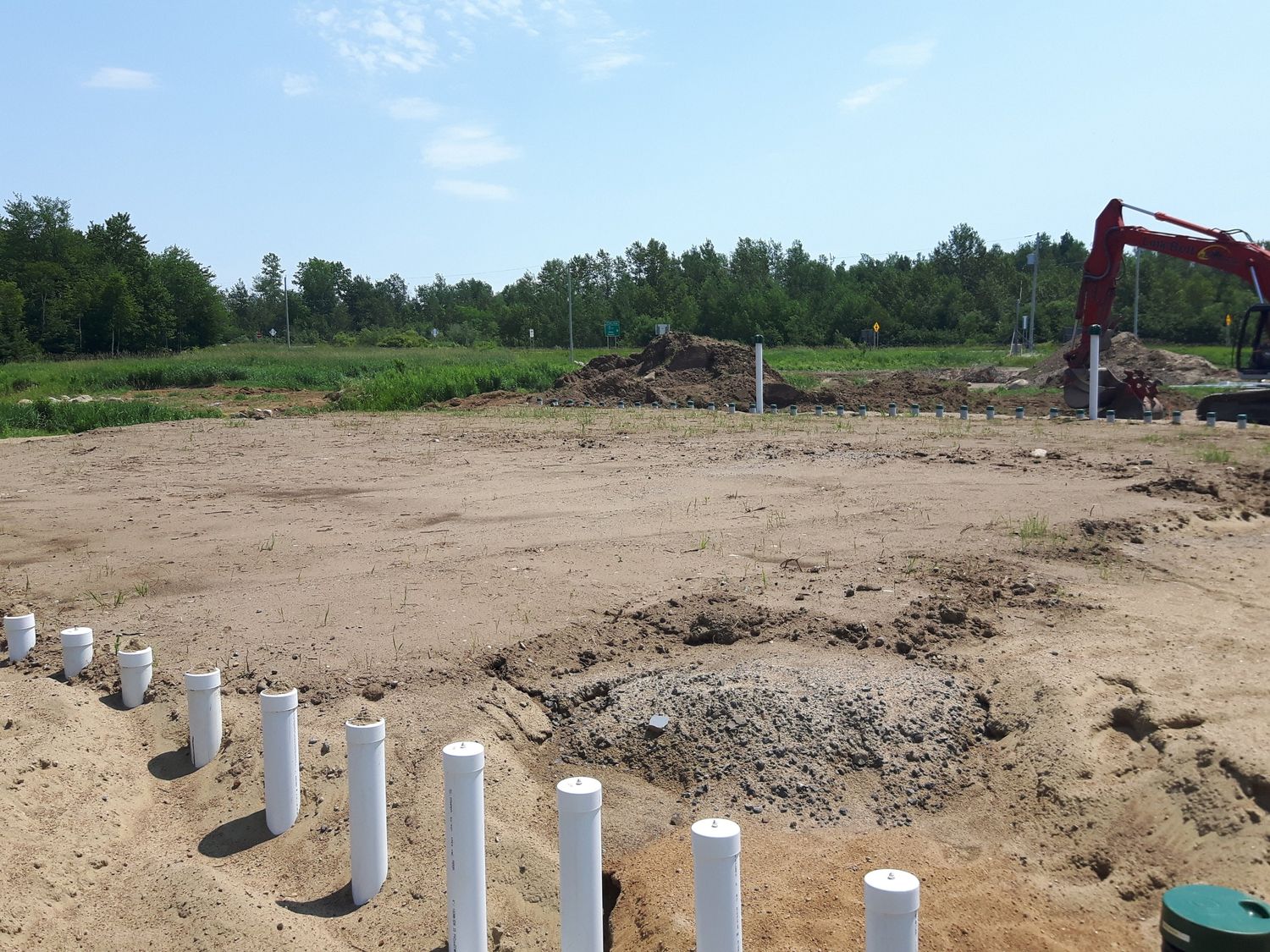 À cause d’un espace restreint, le système utilise une cellule au lieu de plusieurs. Ceci est réalisé en rangées imbriquées de conduites Advanced Enviro))Septic. Au lieu d’avoir qu’une alimentation pour toutes les rangées, le système fonctionne avec trois différents intrants, chacun ravitaillant chaque 3e rangée. Ceci permet de laisser reposer une partie du système sans devoir arrêter le fonctionnement de la cellule entière pour une période de temps.