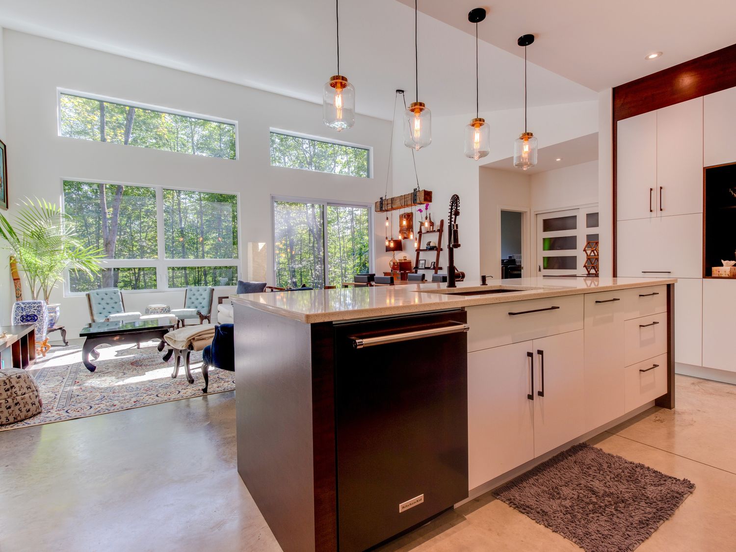 Ce projet contemporain certifié LEED V4 niveau Or et Novoclimat, est situé dans un boisé. Nos clients tenaient à inclure leurs deux passions dans la conception: la musique et le voyage. La maison est de plain-pied, pour profiter d’une accessibilité universelle et minimiser les espaces inutiles. Les clients planifient  fonder une famille dans cette maison, c’est pourquoi les chambres (3) des enfants se situent d’un bord et la chambre des maîtres de l’autre.
