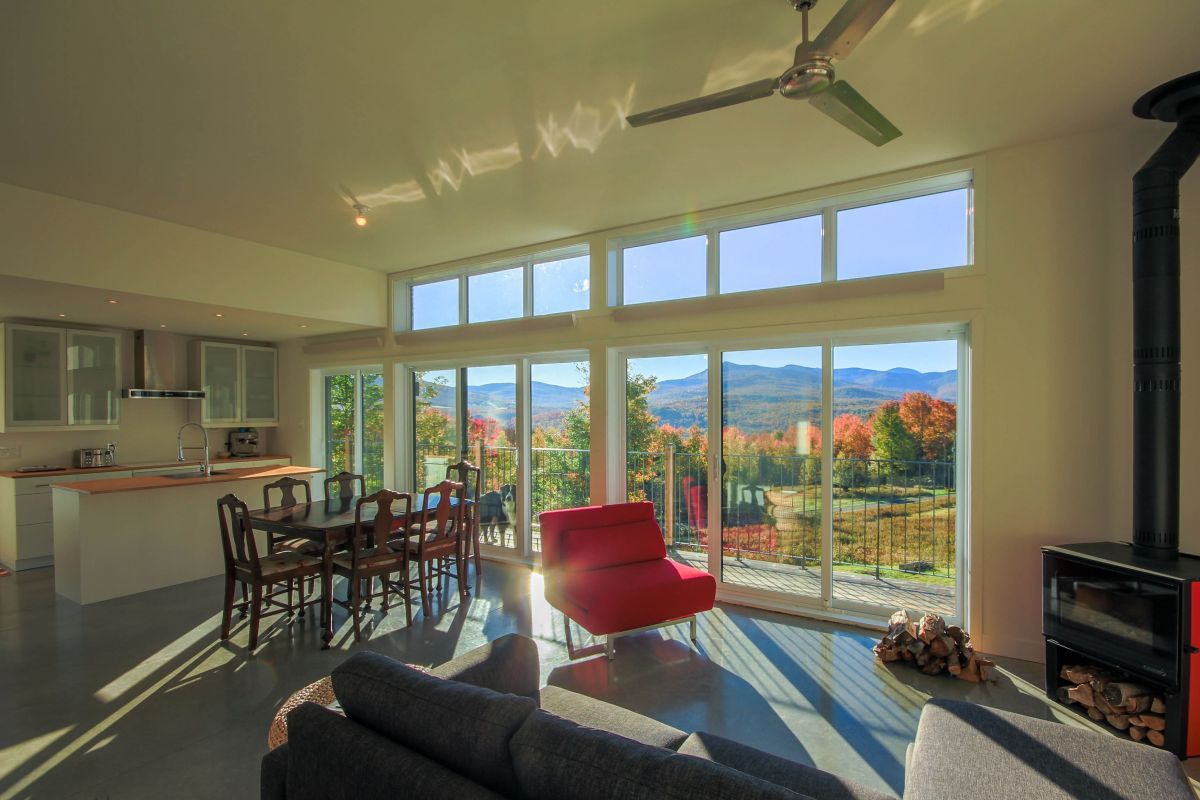 • L’aire de vie, au RDC possède une belle ampleur, qui se nourrit d’un plafond rehaussé à 10’ et du panorama exceptionnel vers la chaîne de montagnes frontalières. La fenestration globale de la maison est judicieusement orientée et bien dosée, pour favoriser les apports solaires ou les limiter, selon la saison.