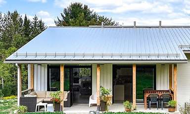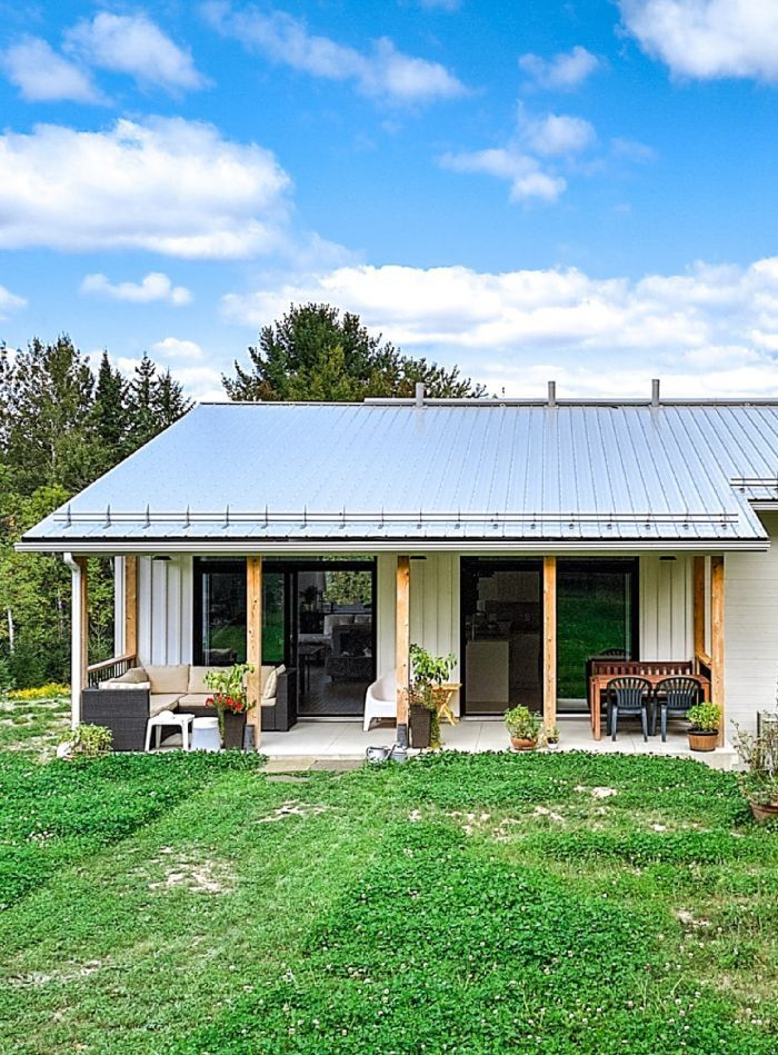 À la fois rustique et chic, cette maison familiale au style farmhouse offre à ses habitants un univers de vie lumineux, accueillant et fonctionnel. La conception solaire passive s’épanouit pleinement sur ce terrain orienté vers le Sud-Est, procurant un grand confort et beaucoup de lumière en toute saison. Le jardinage et la vie dehors font partie du mode de vie de Ginette et Martin : l’accès vers l'extérieur se devait d’être facilité à chaque étage. La terrasse du rez-de-chaussée est contiguë aux aires de vie et mène fluidement au terrain. Au rez-de-jardin, l’entrée de type mud-room, est adjacente au garage mais aussi à la salle de lavage : pratique pour entrer dans la maison quand on a joué dans la terre !