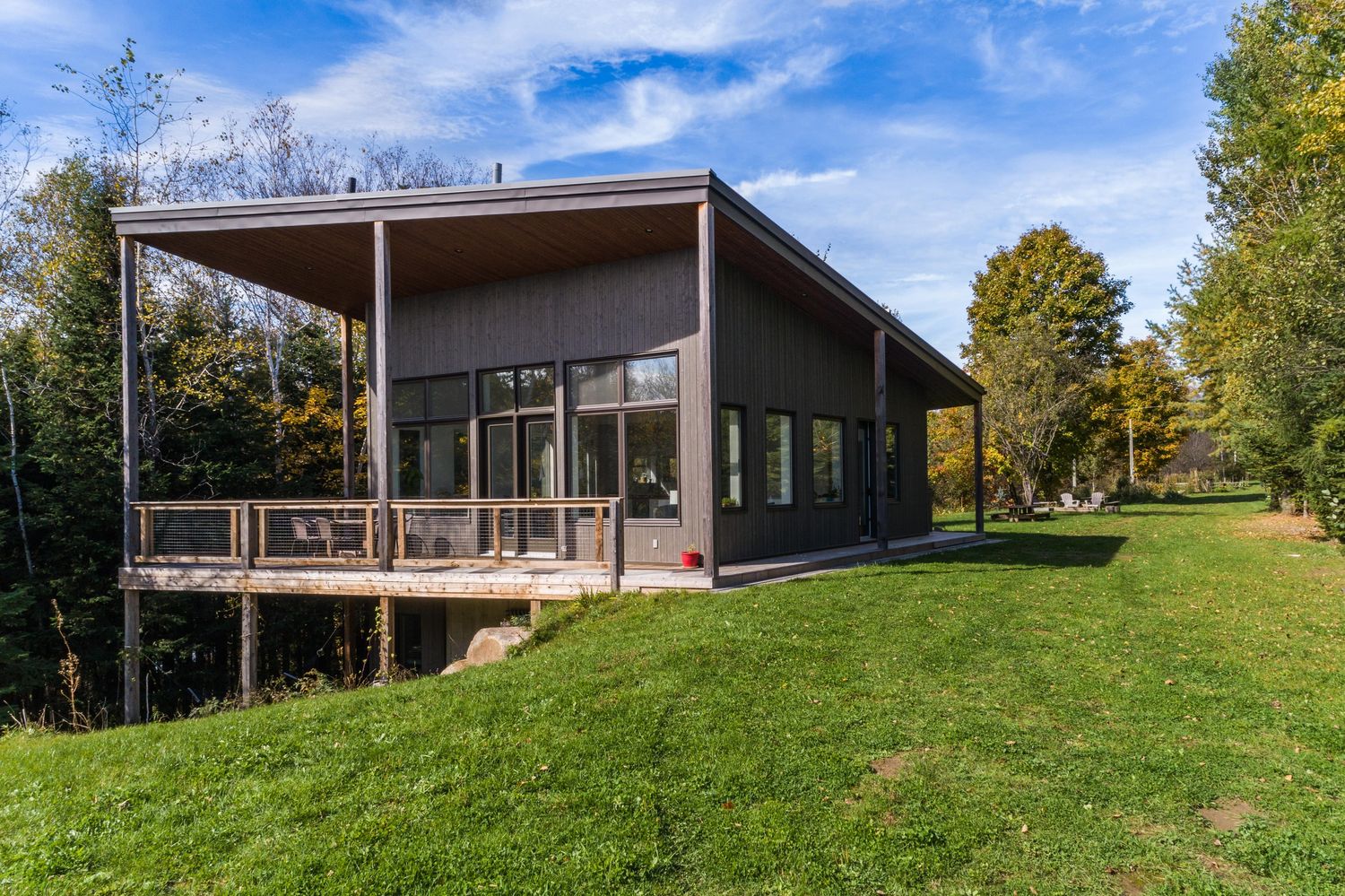 Ève et Jean étaient très attachés à leur terrain, qu’ils avaient partiellement aménagé au fil des années et où ils réunissaient souvent amis et familles. L’idée était donc de bâtir, mais avec comme condition que le projet s’intègre parfaitement au lieu, et en minimisant les impacts sur sa nature.