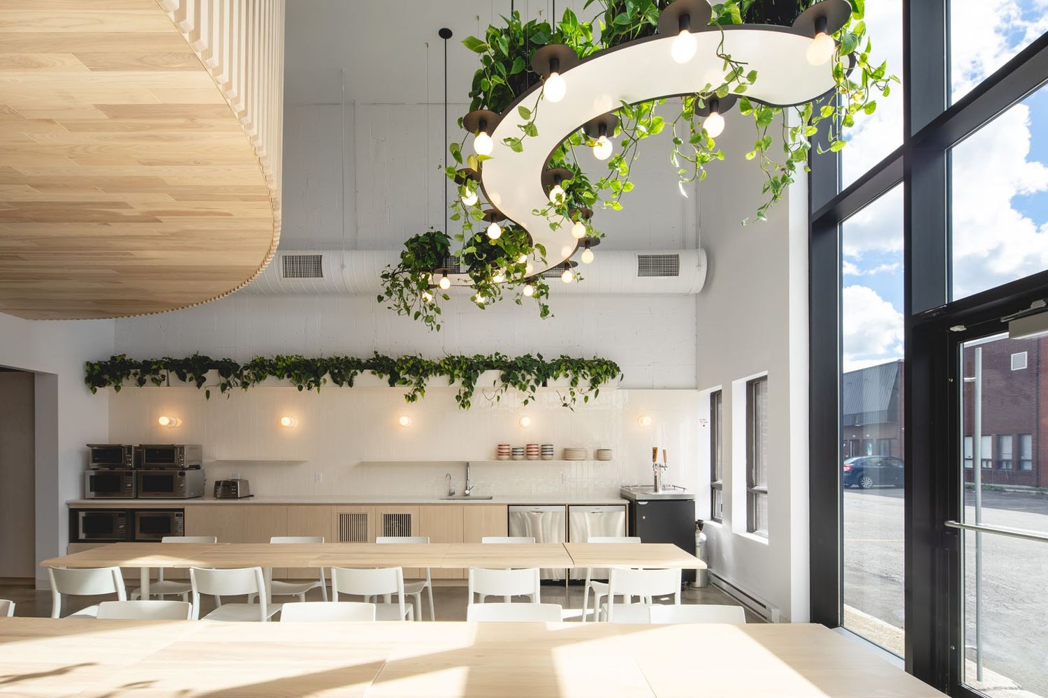 En plaçant les bureaux sur une mezzanine surplombant les vestiaires et les laboratoires, les architectes ont créés une double hauteur spectaculaire qui forme la cafétéria. Un grand mur rideau inonde cet espace convivial d’une lumière qui voyage au travers d’une longue paroi vitrée jusqu’aux espaces administratifs. L’escalier de terrazzo forme un arc de cercle qui se poursuit en une passerelle de bois d’où l’on accède aux bureaux en admirant l’ensemble. Suspendues à des endroits clés, des plantes d’intérieur viennent compléter cet environnement stimulant qui pétille comme un bon verre de Kombucha!