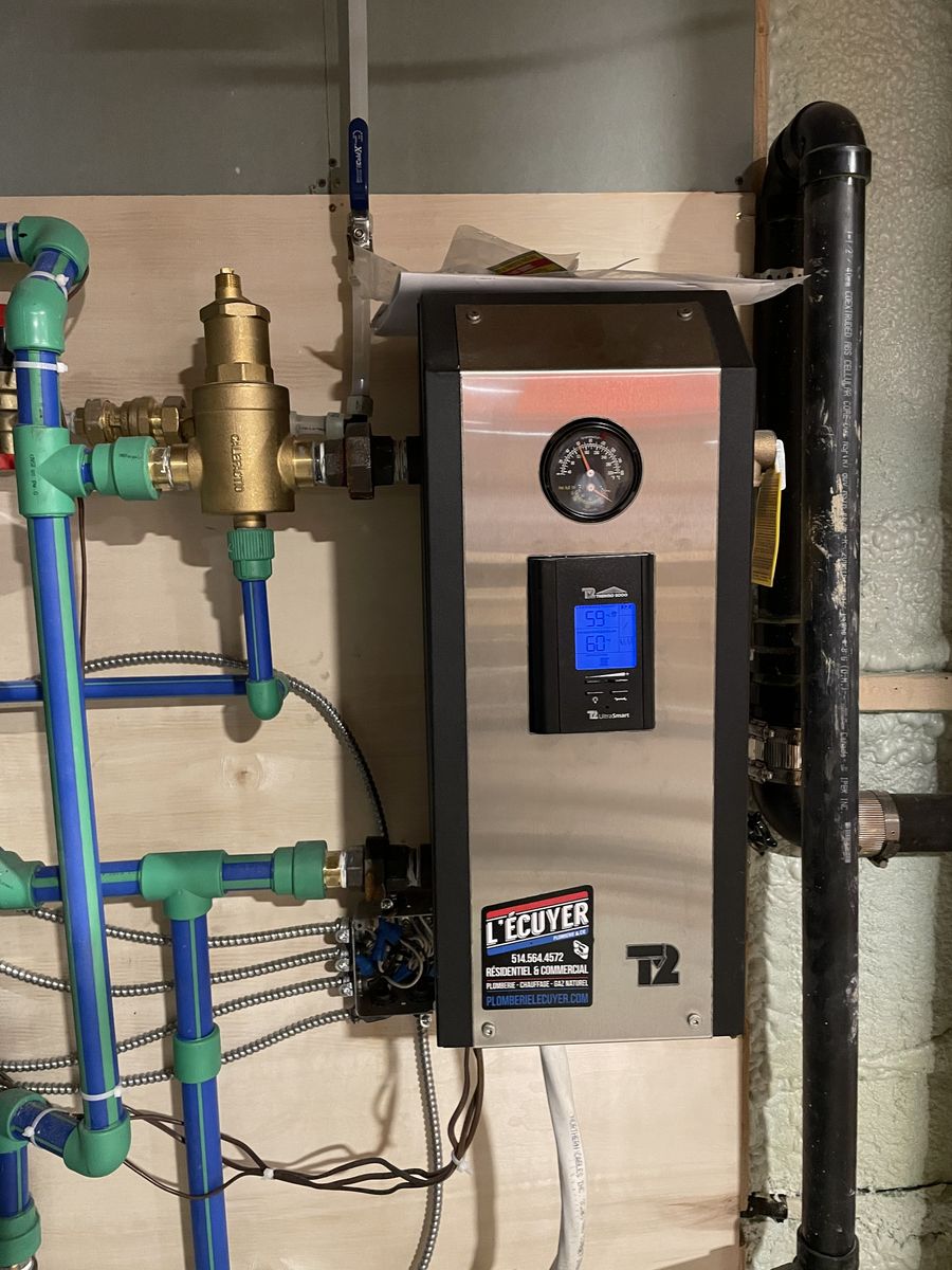 Conception et installation complète d'un système de chauffage hydronique combinant un plancher chauffant au sous-sol ainsi que des radiateurs au rez-de-chaussé et à l'étage.