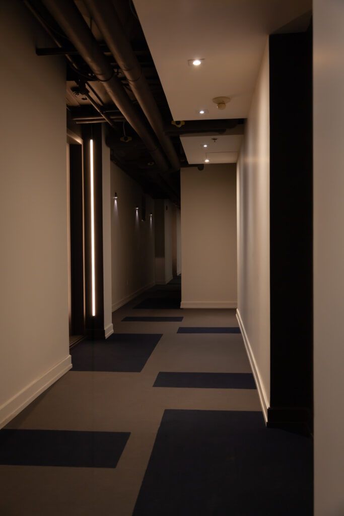 Le faux plafond a été démoli pour donner de la hauteur aux corridors, en mettant en scène les conduits mécaniques peints en noir. Il en résulte une allure chic et industrielle correspondant bien à l’identité visuelle générale de l’immeuble.