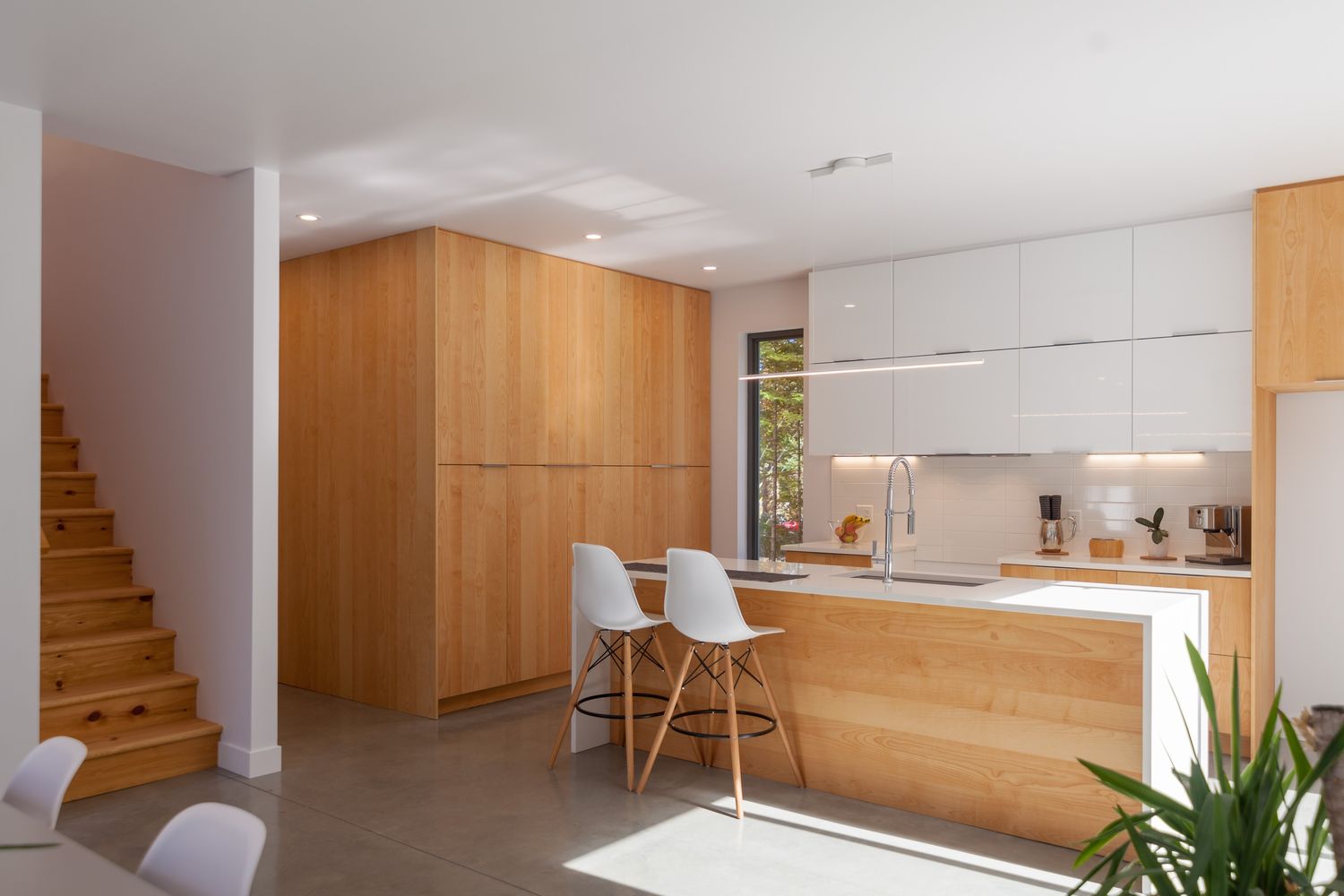 La forme de la maison s’étire plein sud pour profiter au maximum de la luminosité et du gain solaire passif en hiver grâce à une fenestration abondante et une dalle sur sol de béton LEED, à contenus recyclés, emmagasinant la chaleur le jour et la diffusant la nuit, améliorant ainsi le confort des occupants.
